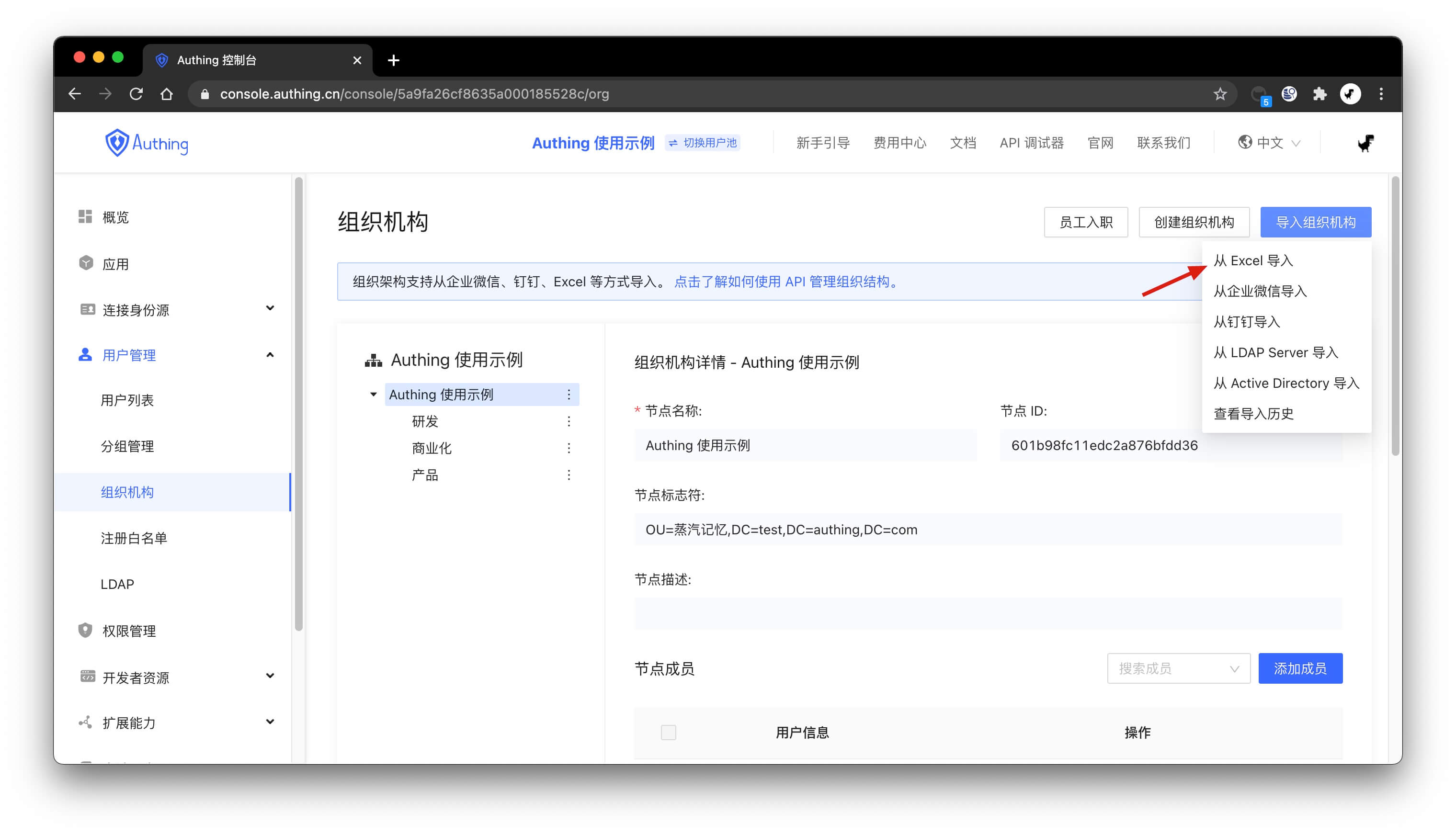 在控制台组织机构管理页面,点击 导入组织机构 - 从 Excel 导入 按钮: