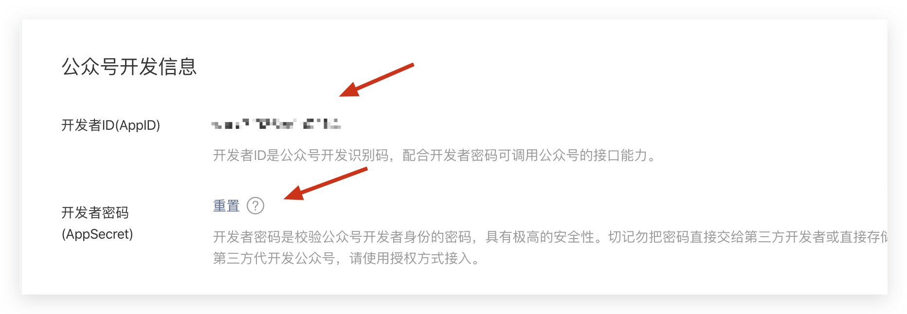 你可以在微信公众平台后台的 开发 -> 基本配置 页面获取开发者 ID(AppID) 和开发者密码(AppSecret)。