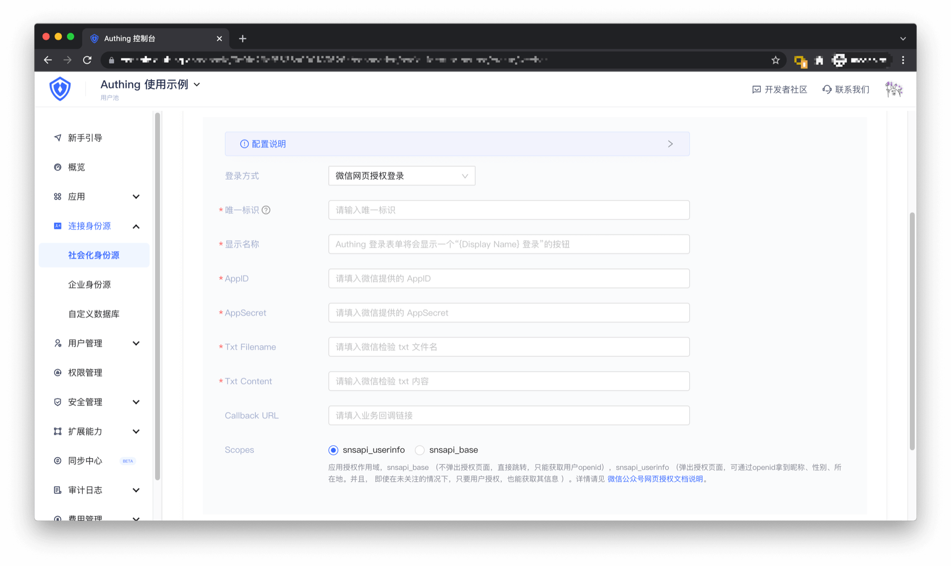 暂时先不要点击保存,你需要将上述配置及 AppID 和 AppSecret 填入 Authing 控制台中。在 连接身份源 - 社会化登录 中选择 微信,连接方式选择微信公众号扫码关注登录,填入上述配置: