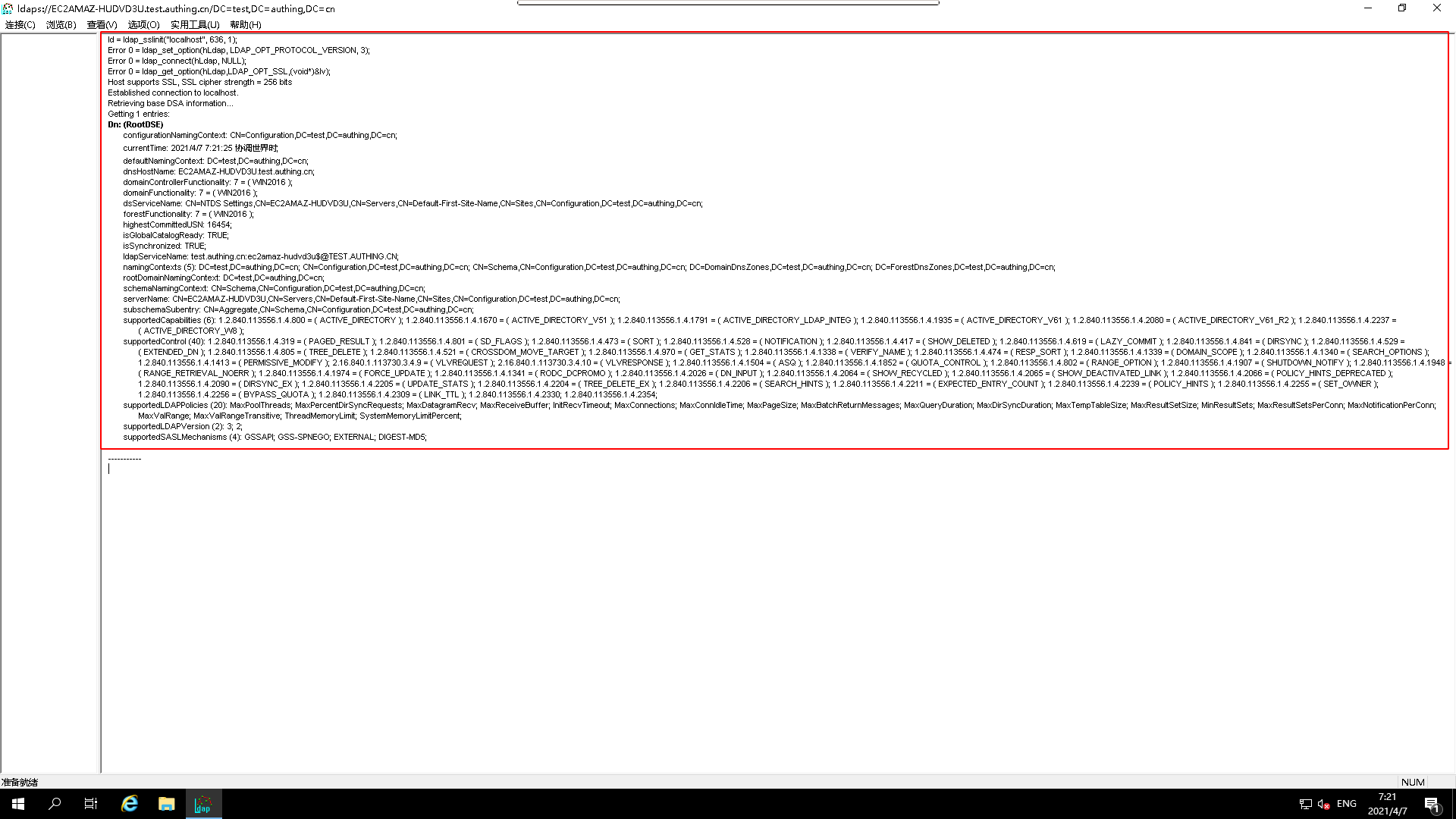 ldp进行连接测试, 无需输入更多ldap连接相关信息即可获取响应结果, 你也可以使用一些客户端(如 Apache Ldap Studio 等)来完成连接测试。当然AD 管理中心可以打开也意味着当前你的连接测试是没有问题的。