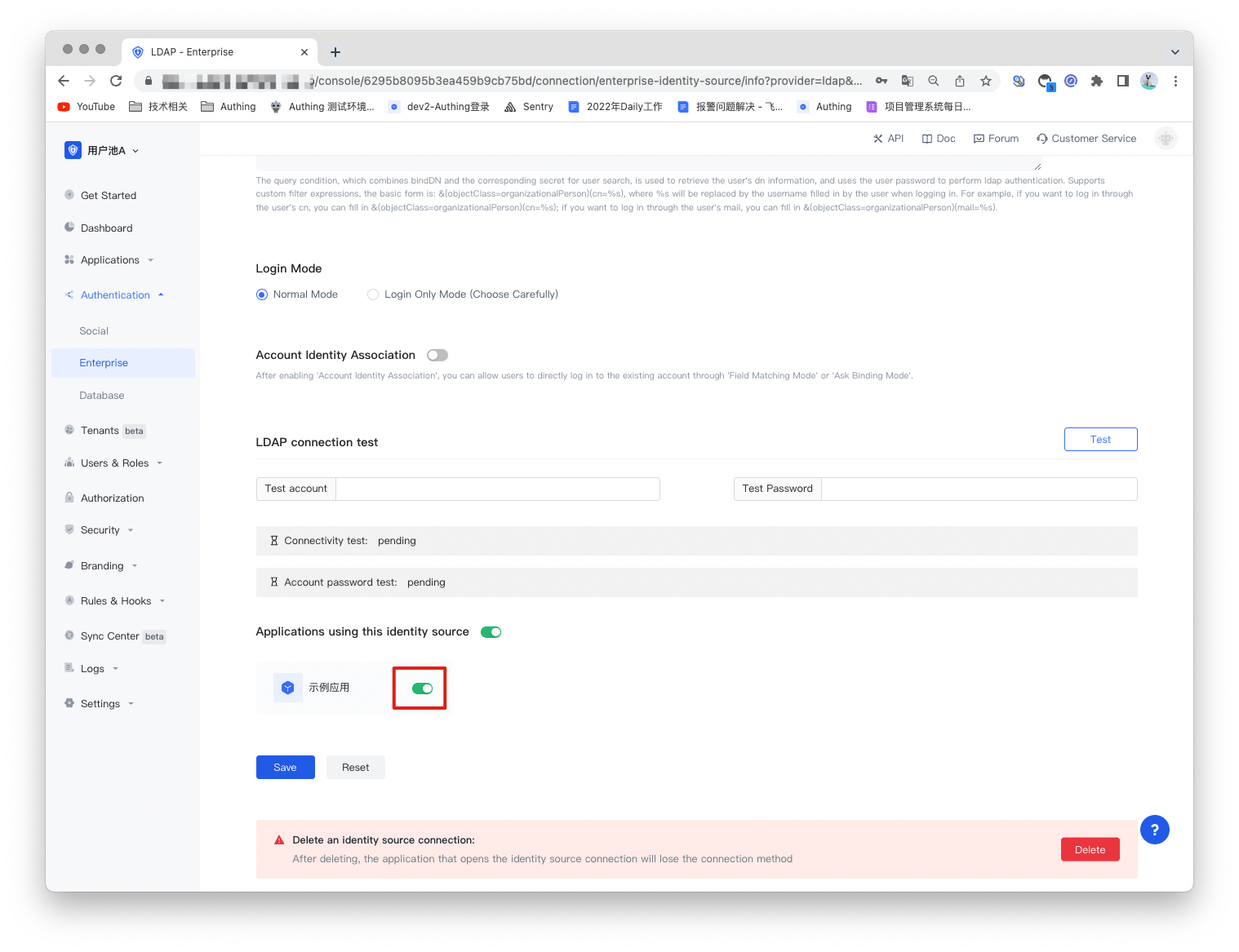 3.2 On the created LDAP identity source connection details page, open and associate an application created in the Authing console.