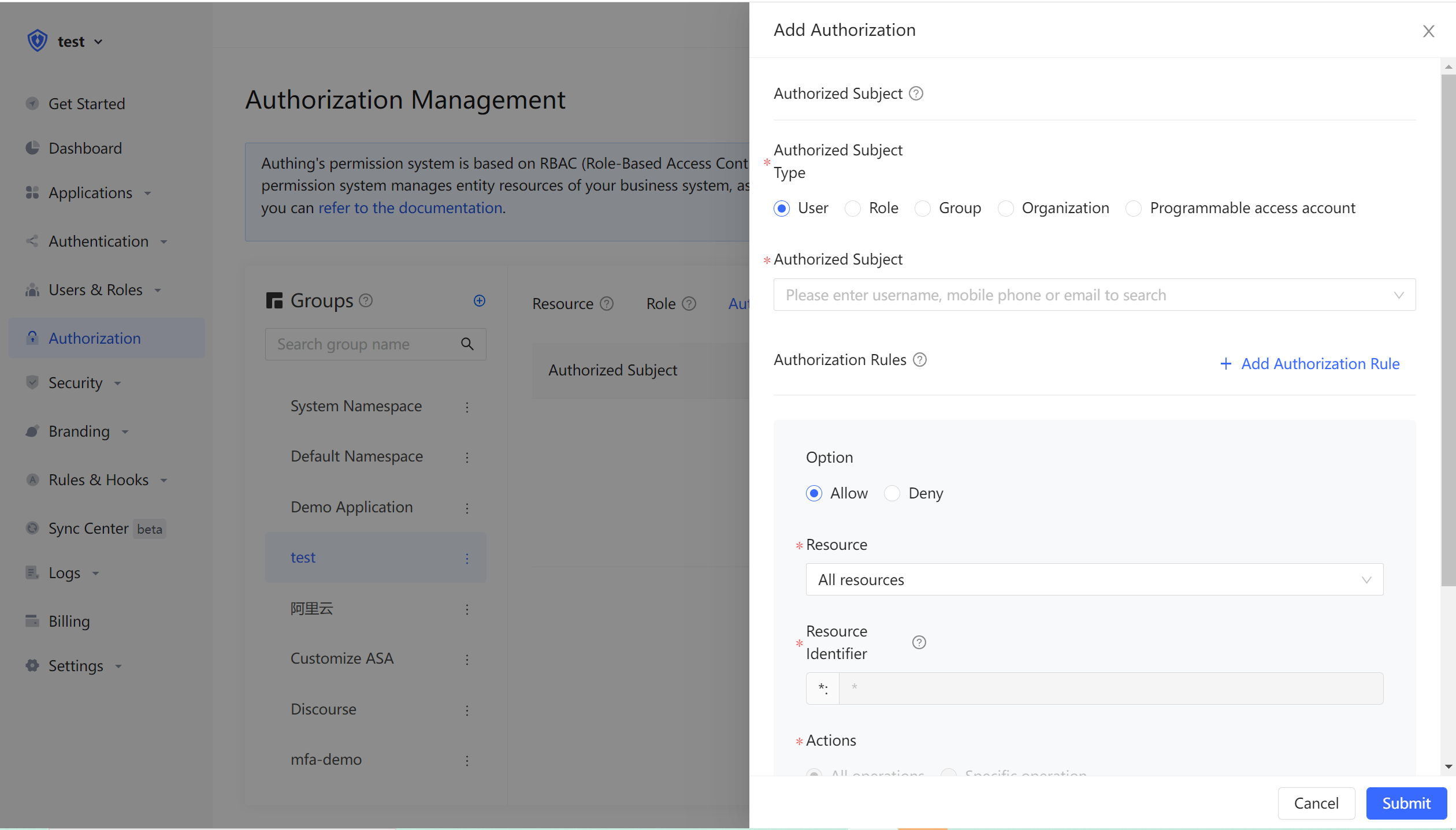In the previous step, we do privilege management based on whether the user has a certain role. This privilege management is relatively coarse-grained, because it only judges whether the user has a certain role, but does not judge whether it has a specific permission. Based on the role-based access control model (RBAC), Authing can also perform more fine-grained authorization in resources.