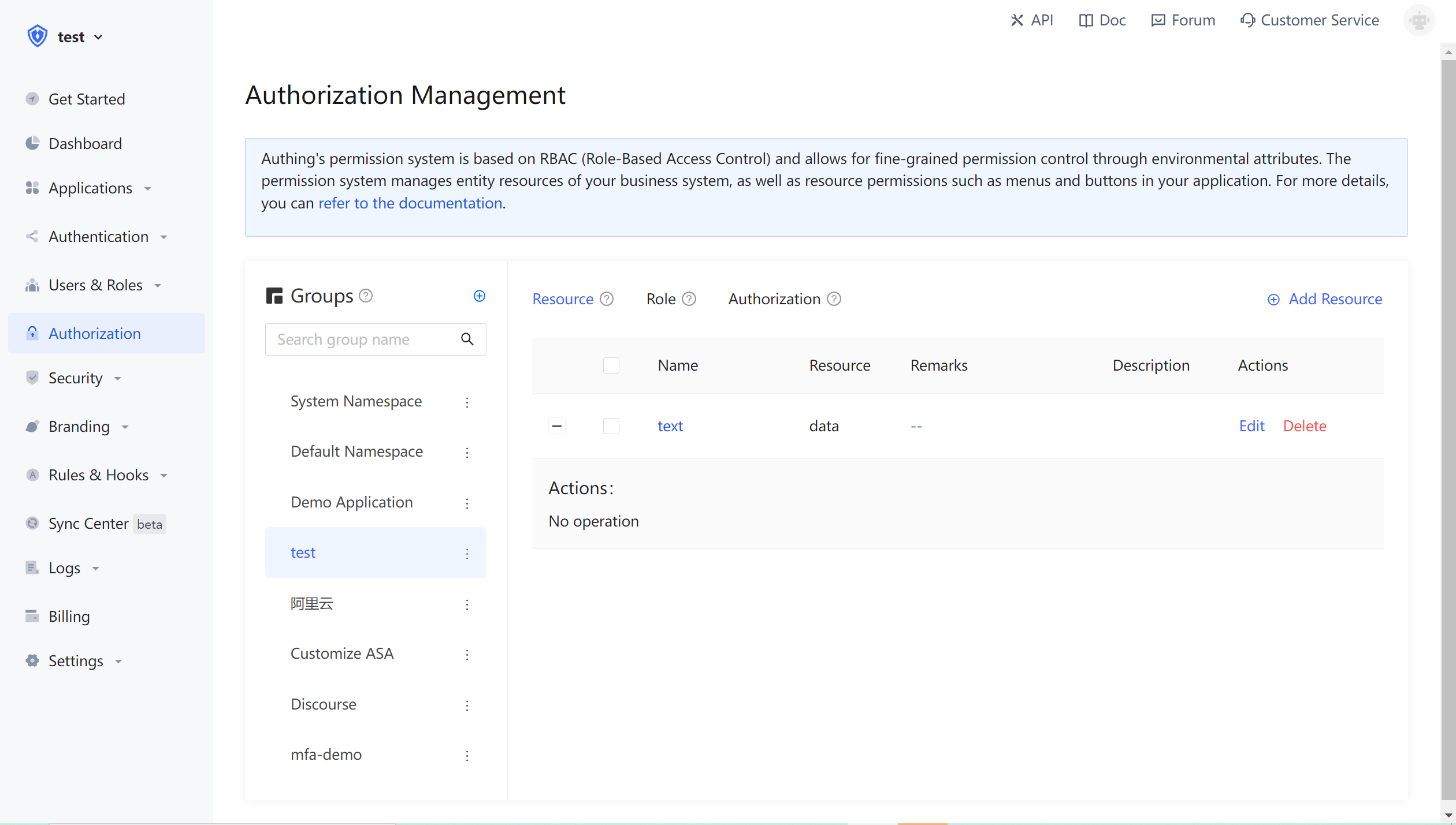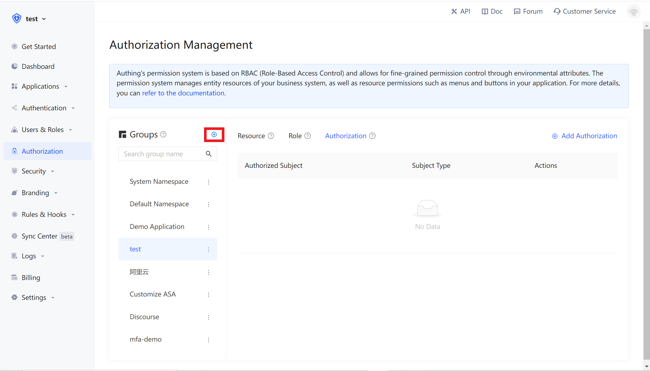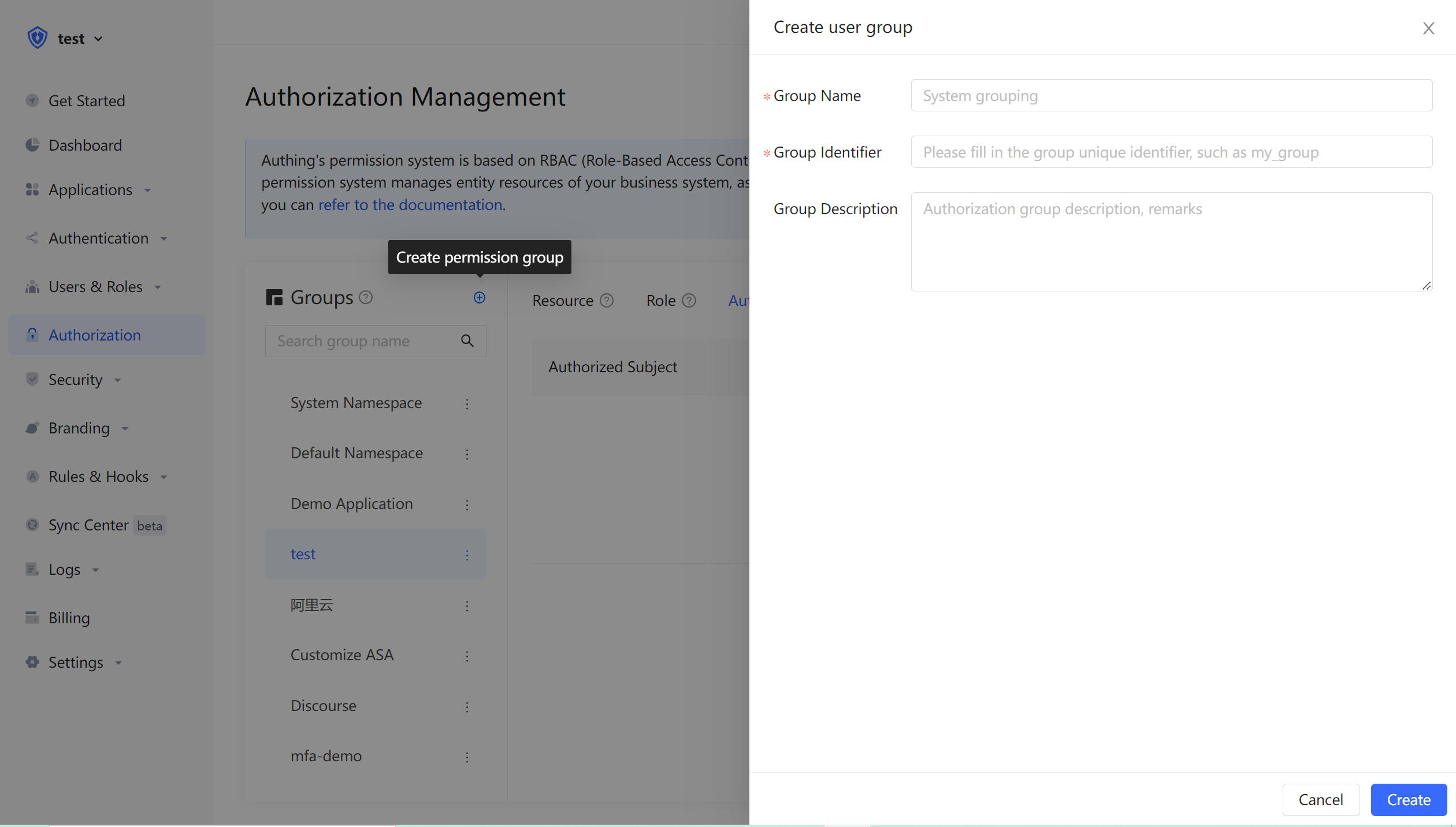 When each application is created, Authing will create a privilege group for you. The automatically created privilege group is named as application name, and the id is the application ID, which cannot be modified. Authing will also create a default privilege group for each user pool. When your privilege resources are relatively simple and do not need to be managed separately at the application level, you can just use the default privilege group. When one of your applications is more complicated or has conflicting roles or resources exist, you can manually create privilege groups by yourself to isolate and manage privilege resources.