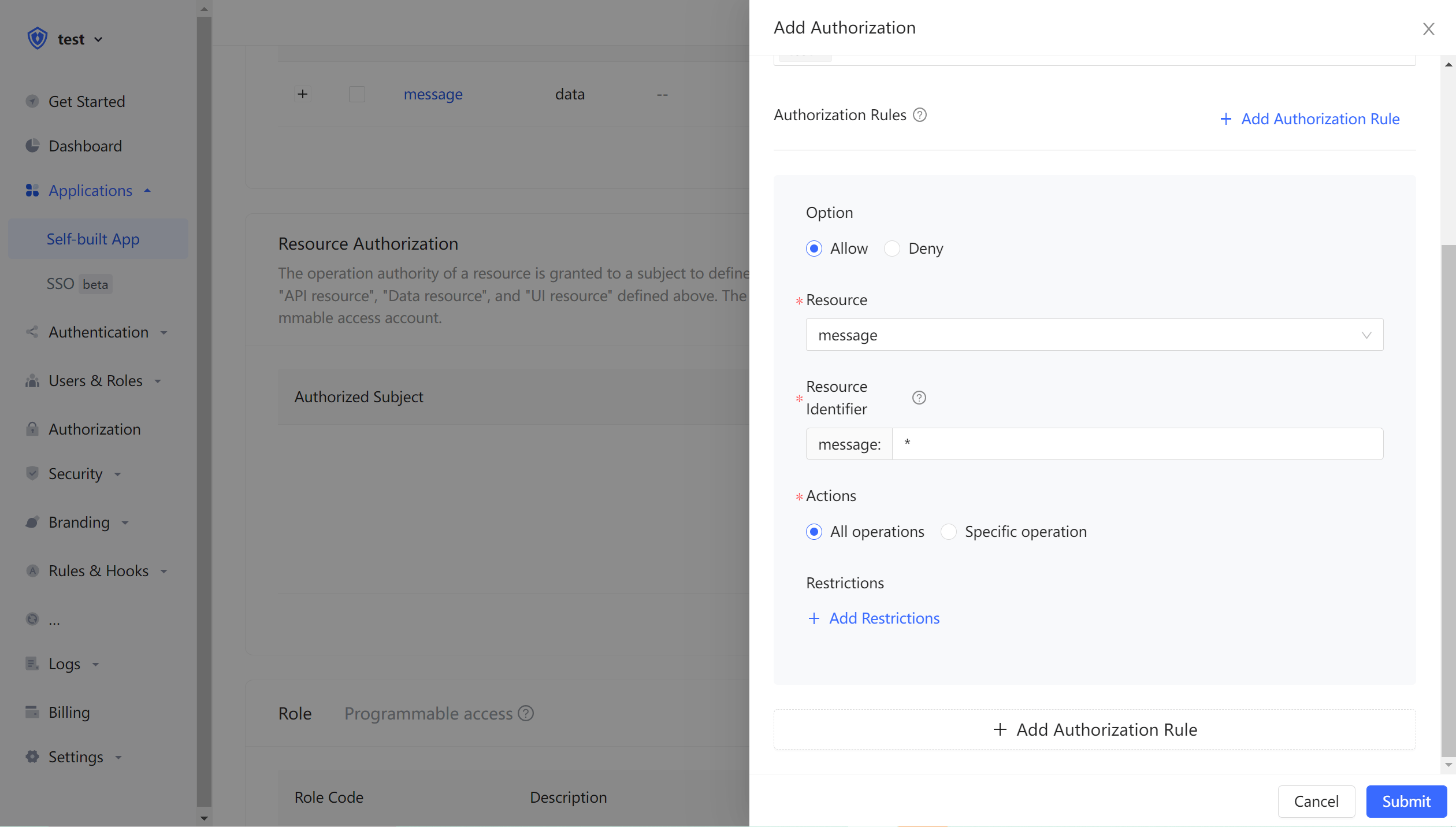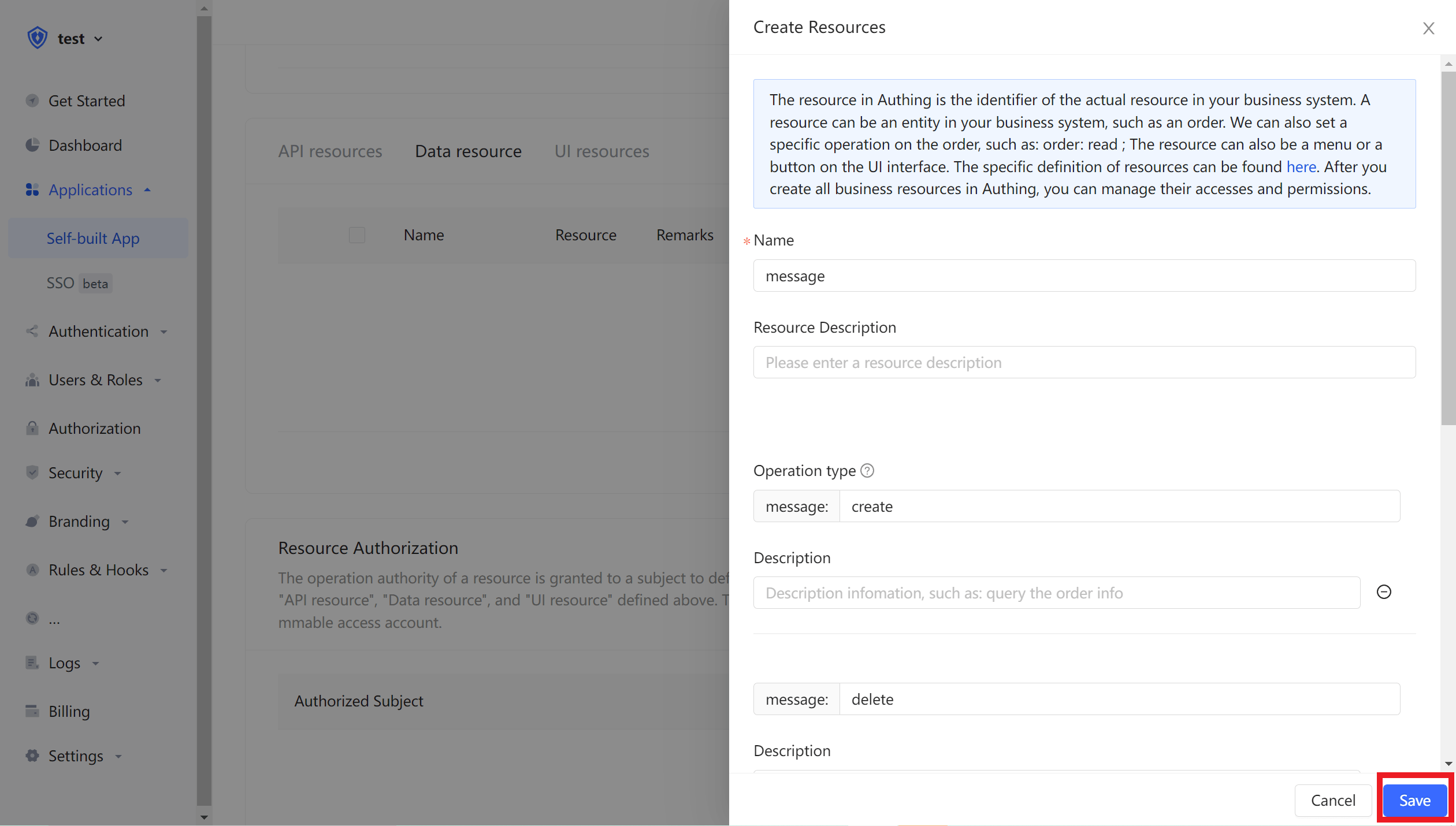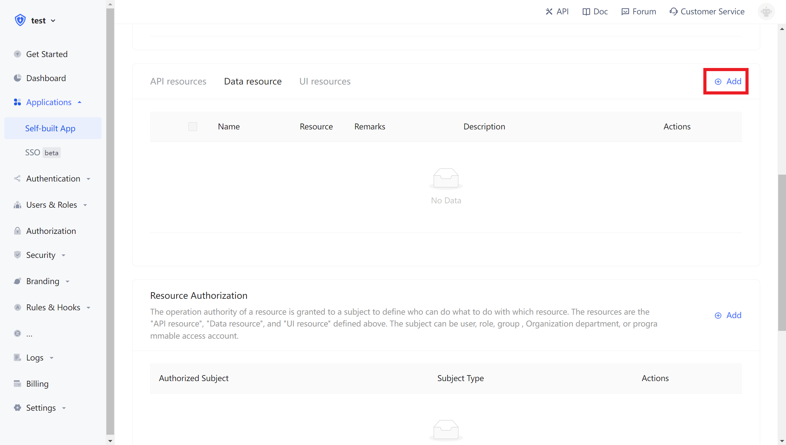 In the application details, click the Authorization tab, switch to the Data Resources tab, and then click Add.