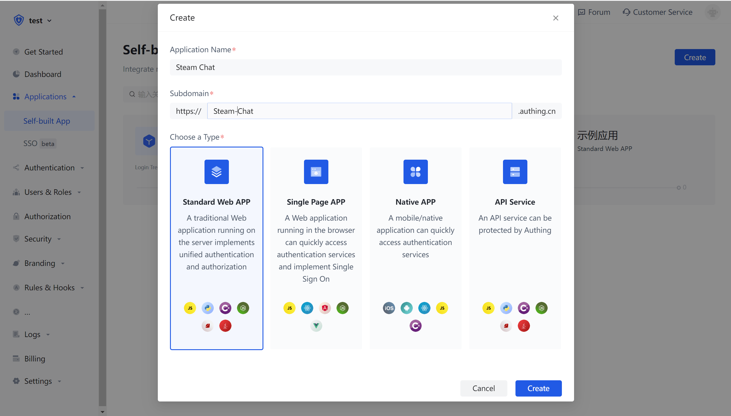 Create an application in Authing. Suppose our social software is called "Steam Chat", then the application name is called "Steam Chat".
