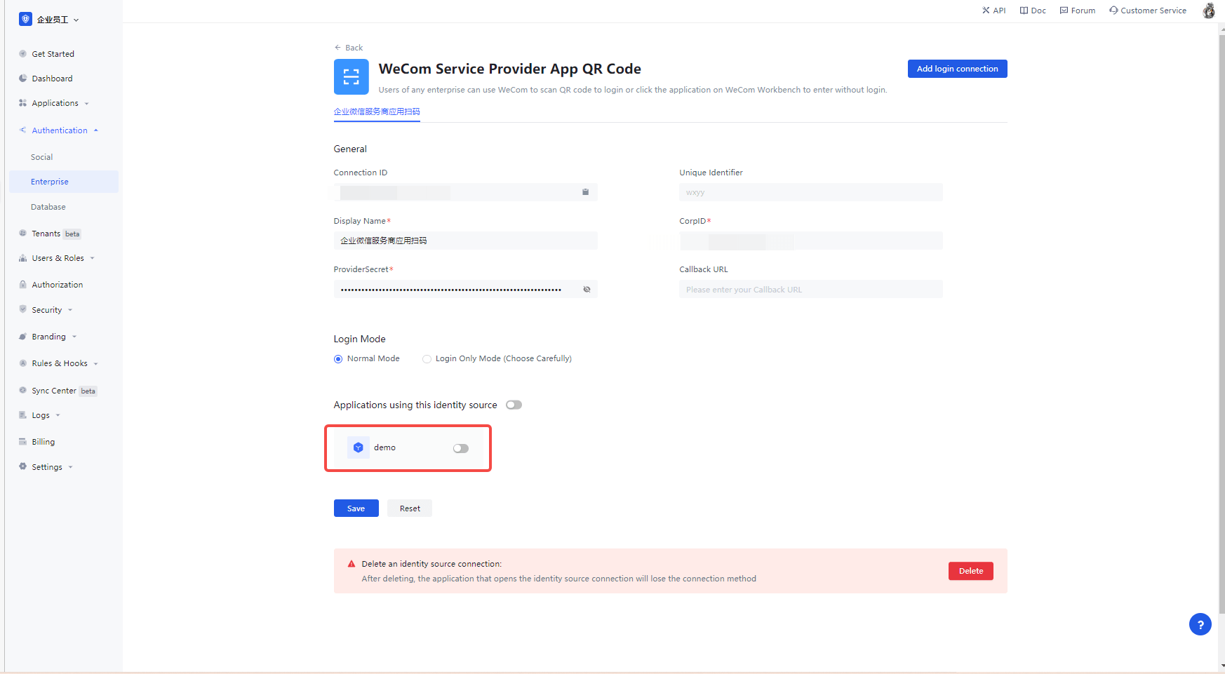 3.2 In the created WeCom Service Provider App QR Code Source Connection details page, open and associate an app created in the Authing console
