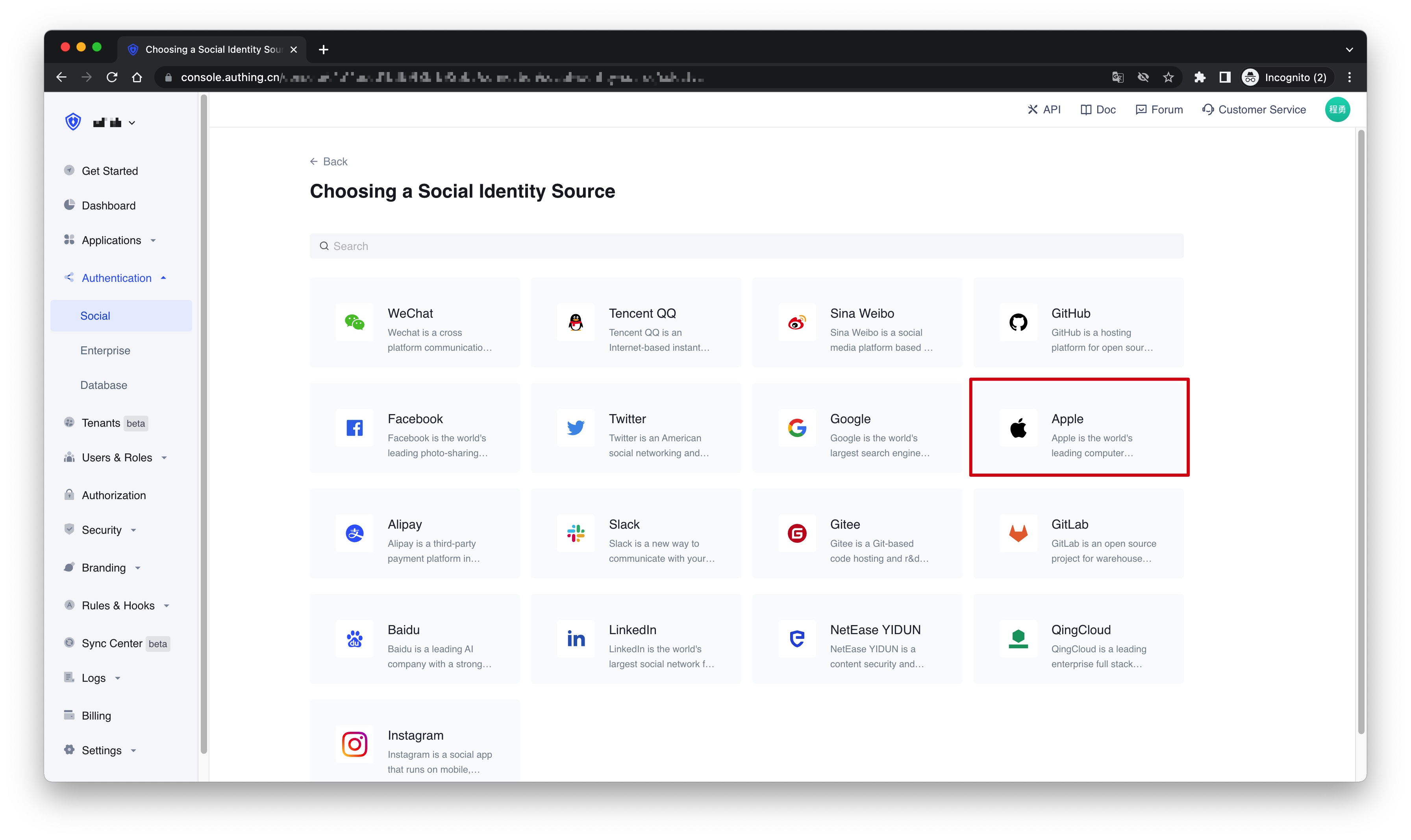 2.2 On the "Choosing a Social Identity Source" page, click the "Apple" card.