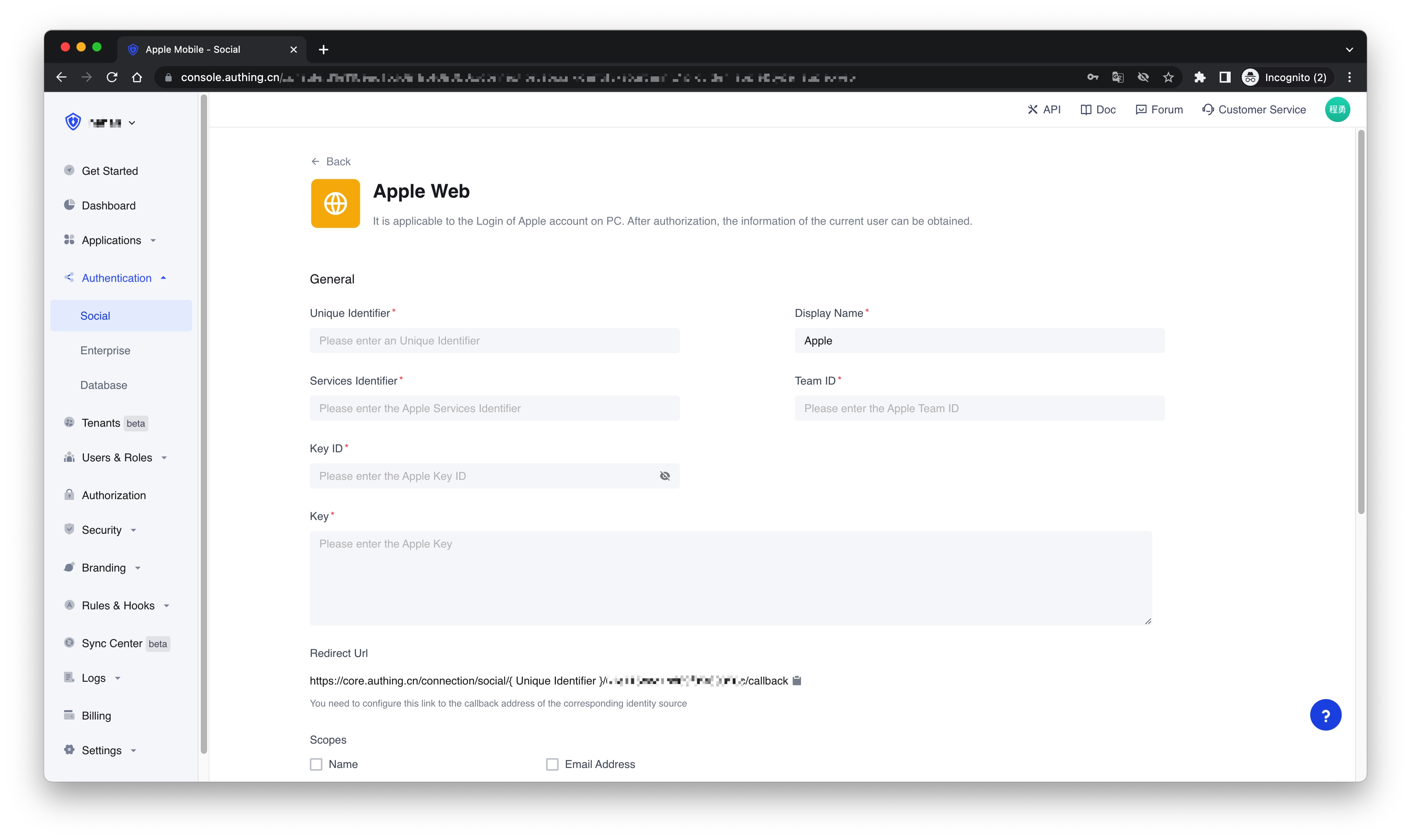 ¶ Step 2: Configure Apple in the Authing Console