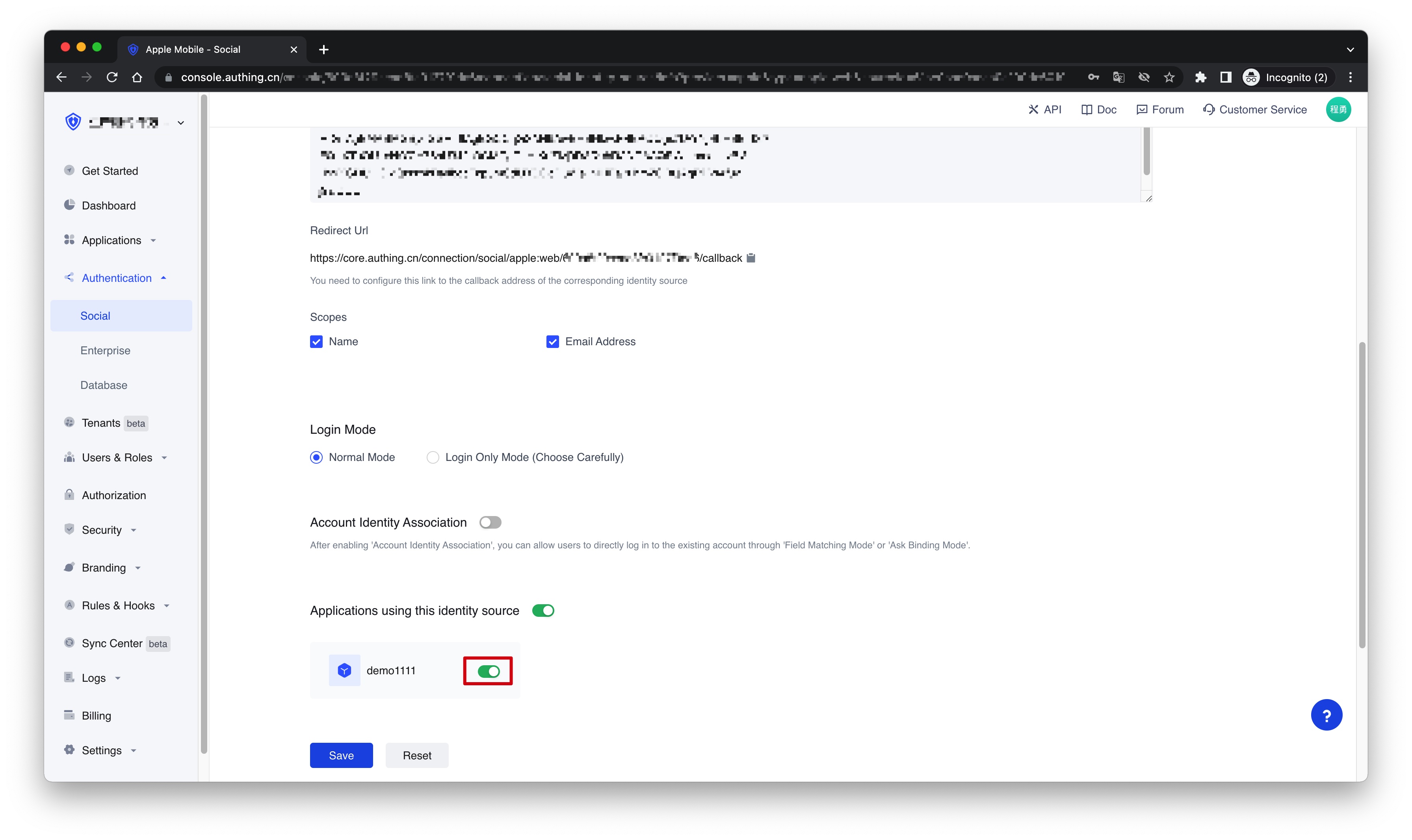 3.2 On the created "Apple Web" identity provider connection details page, open and associate an application created in the Authing Console