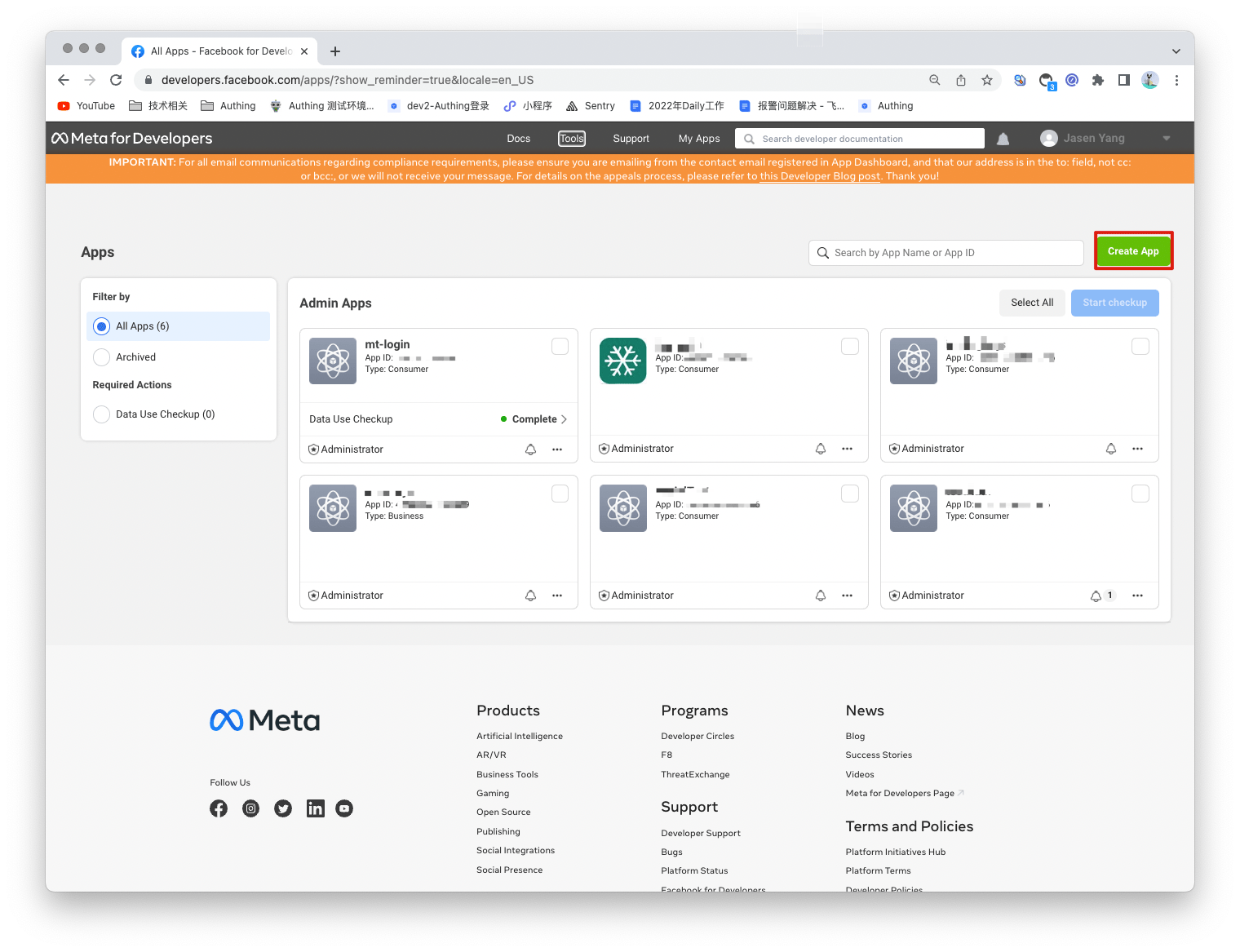 Go to developers.facebook.com (opens new window), click My Apps, then create a new app and select Consumer or No App Type , fill in the application name.