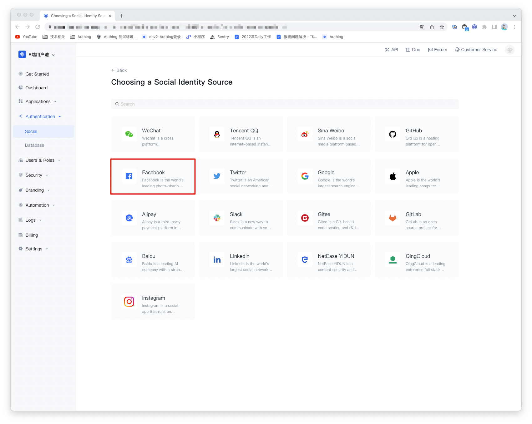 2.2 Please go to the 「Social Identity Source」 - 「Select Social Identity」 page of the Authing Console, and click the 「Facebook」 identity source button to enter the 「Facebook Login Mode」 page.