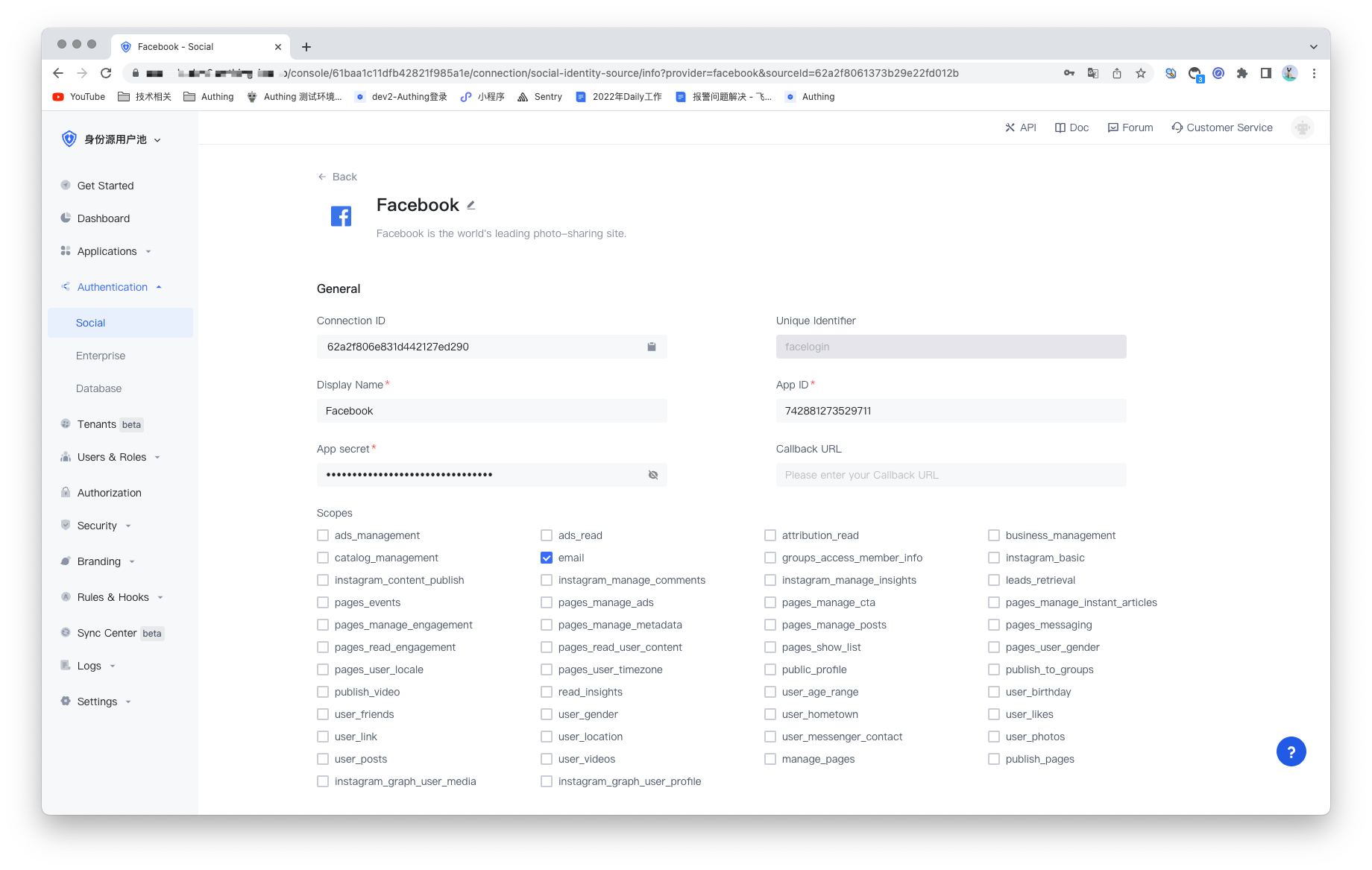 2.3 Please configure the relevant field information on the 「Social Identity Sources」 - 「Facebook」 page of the Authing Console.