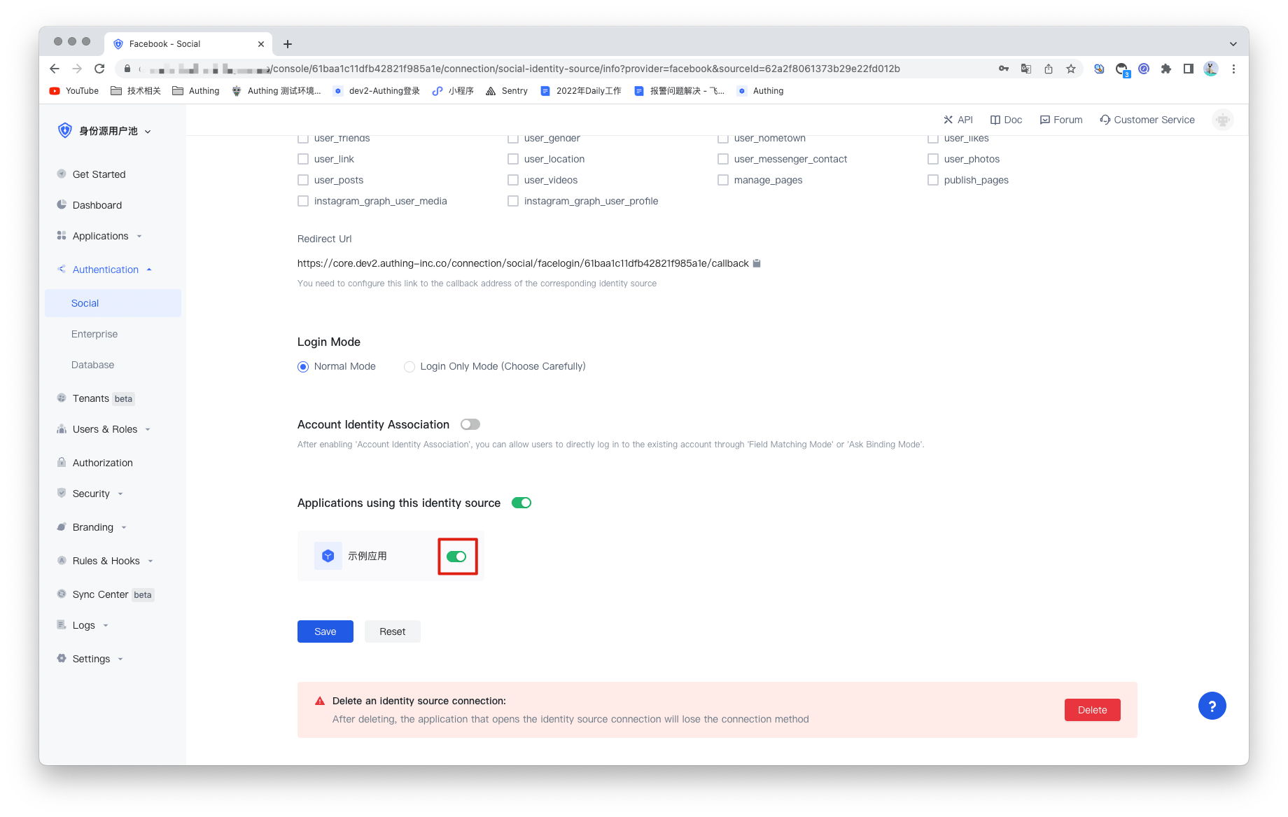 3.2 On the created Facebook'= identity source connection details page, open and associate an app created in the Authing console.
