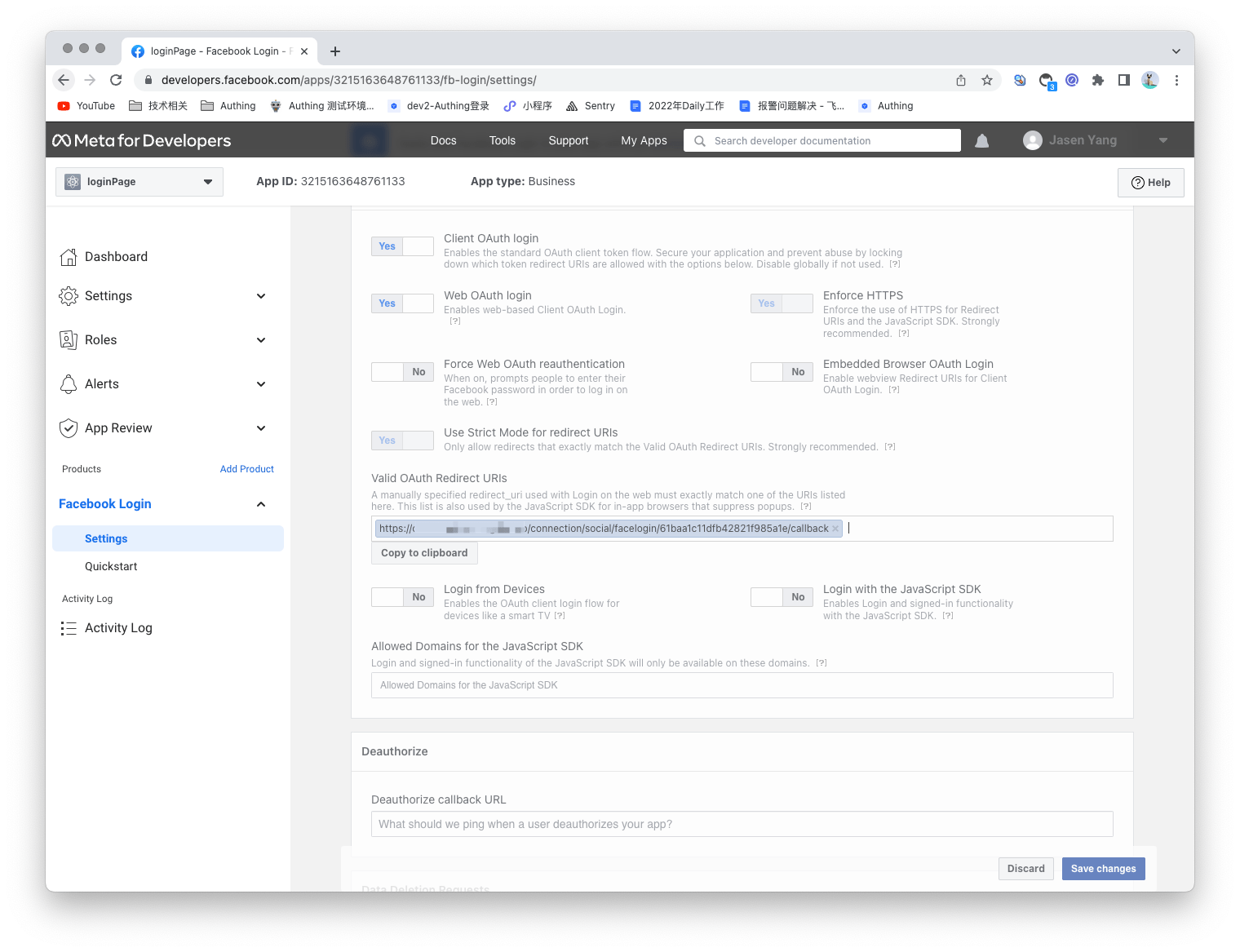 After the Facebook identity source is created on the Authing console, the callback address needs to be configured in the Facebook app on Facebook's open platform OAuth Client Authorization Settings.