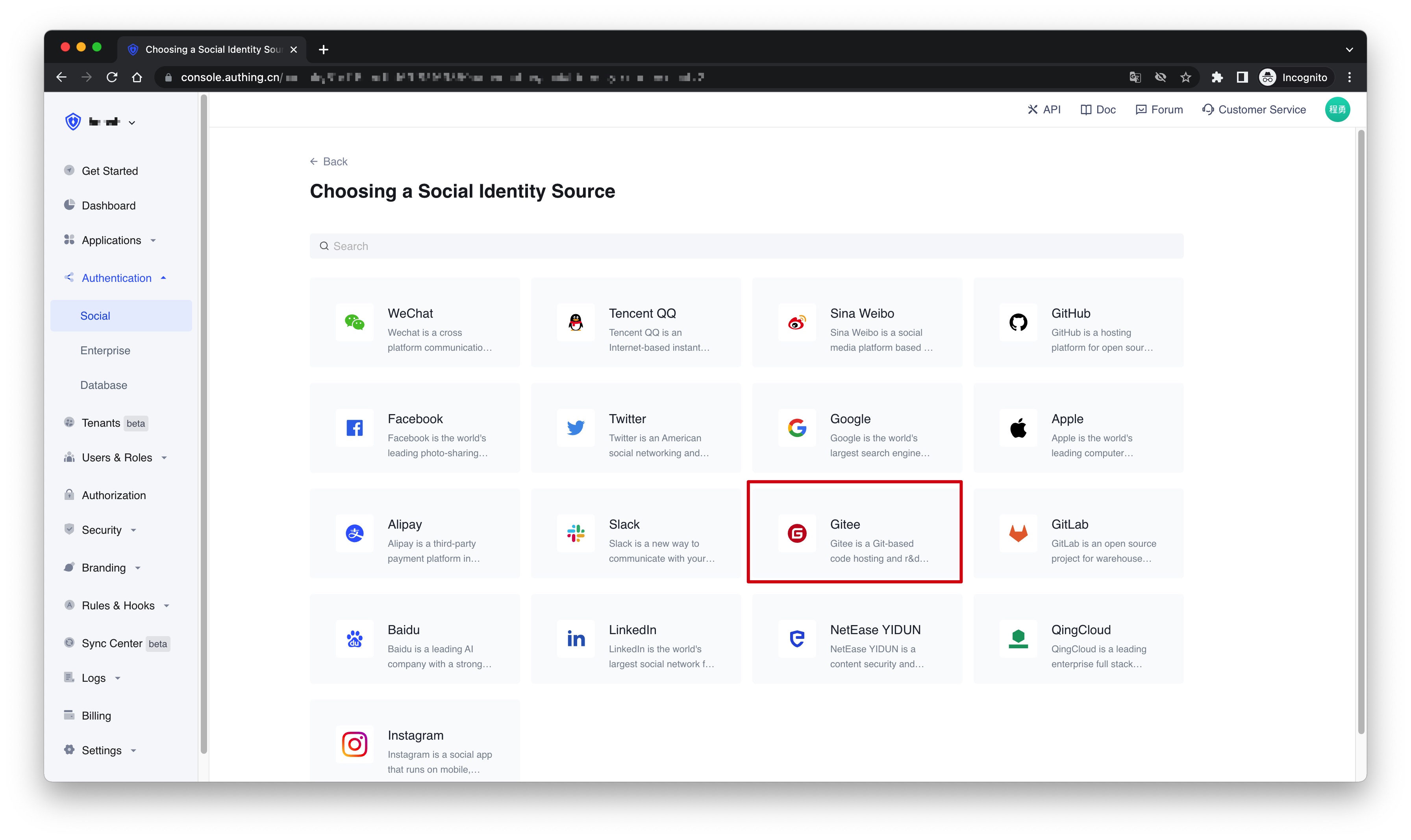 2.2 On the "Choosing a Social Identity Source" page, click the "Gitee" card.