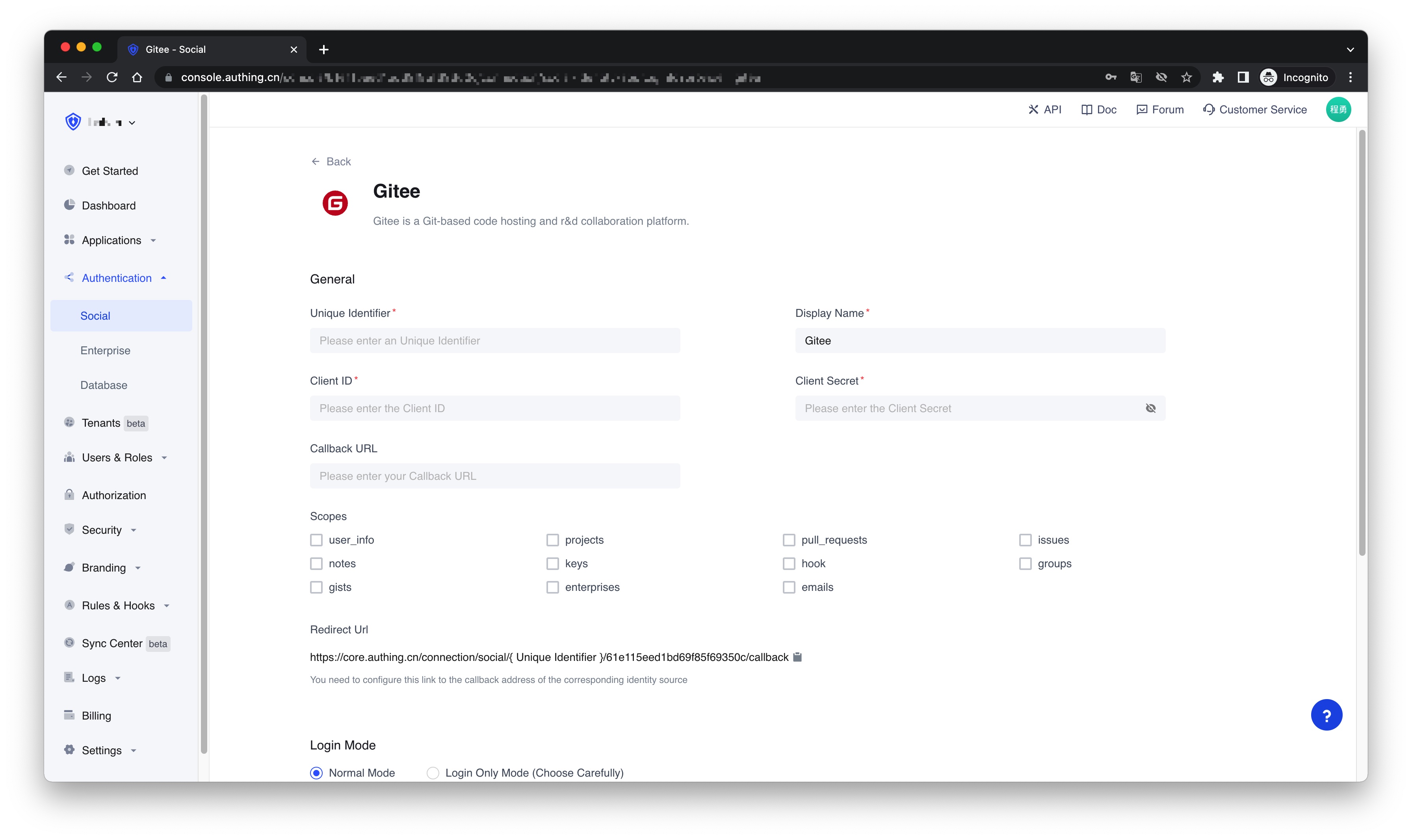 - Overview: Gitee social login is a user who uses Gitee as the identity provider to securely log in to a third-party application or website. By configuring and enabling Gitee's social login in Authing, you can quickly obtain basic open information of Gitee through Authing and help users achieve password-free login.
