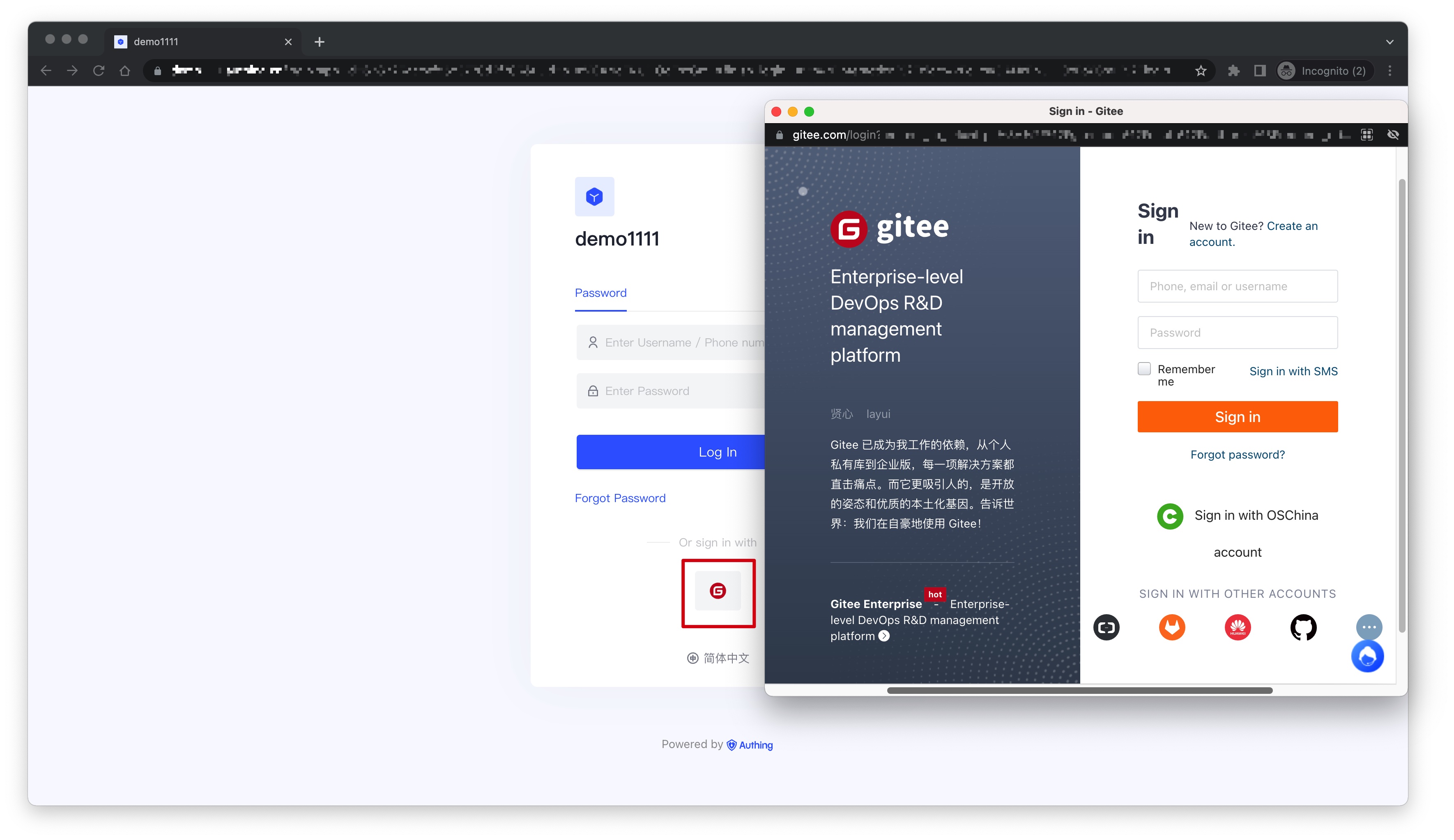 3.3 Click the "Experience Login" button of the app in the Authing Console, and experience the "Gitee" login in the pop-up login window