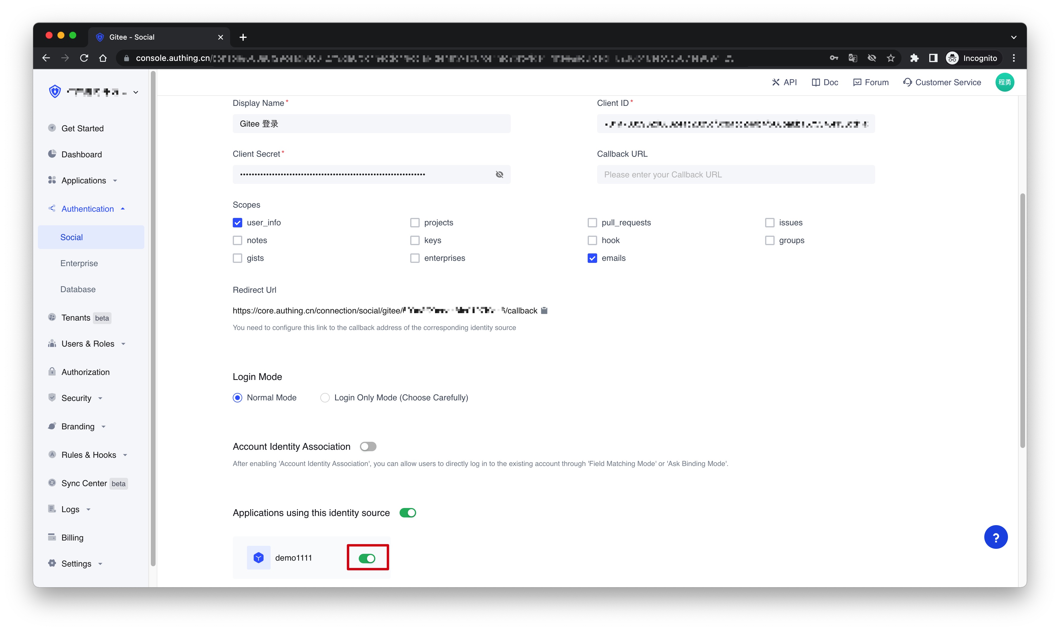 3.2 On the created "Gitee" identity provider connection details page, open and associate an application created in the Authing Console