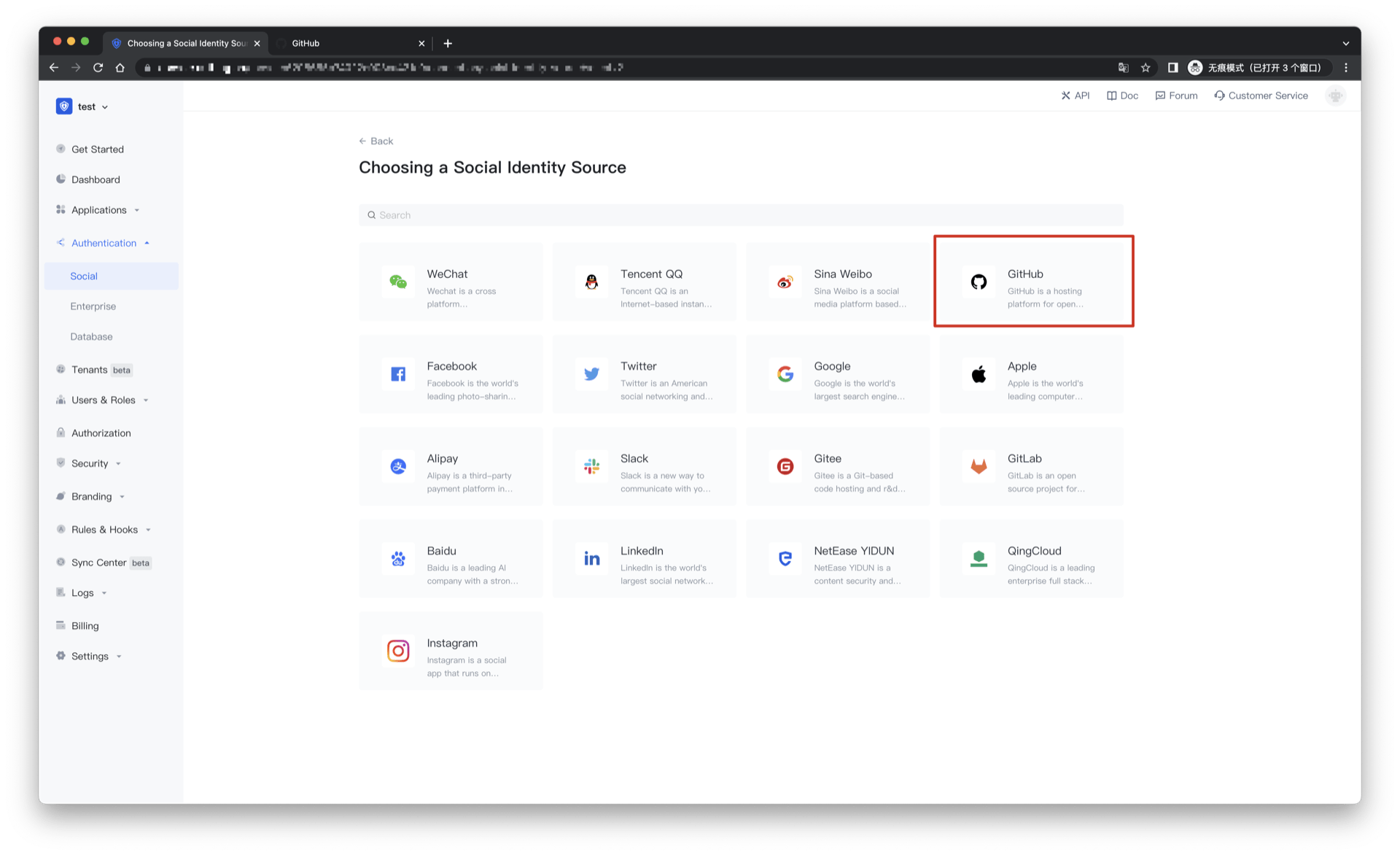 2.2 Please click the "Github" identity source button on the "Create Connection" - "Choosing a Social Identity Source" page of the Authing console to enter the "Github Login Mode" page.