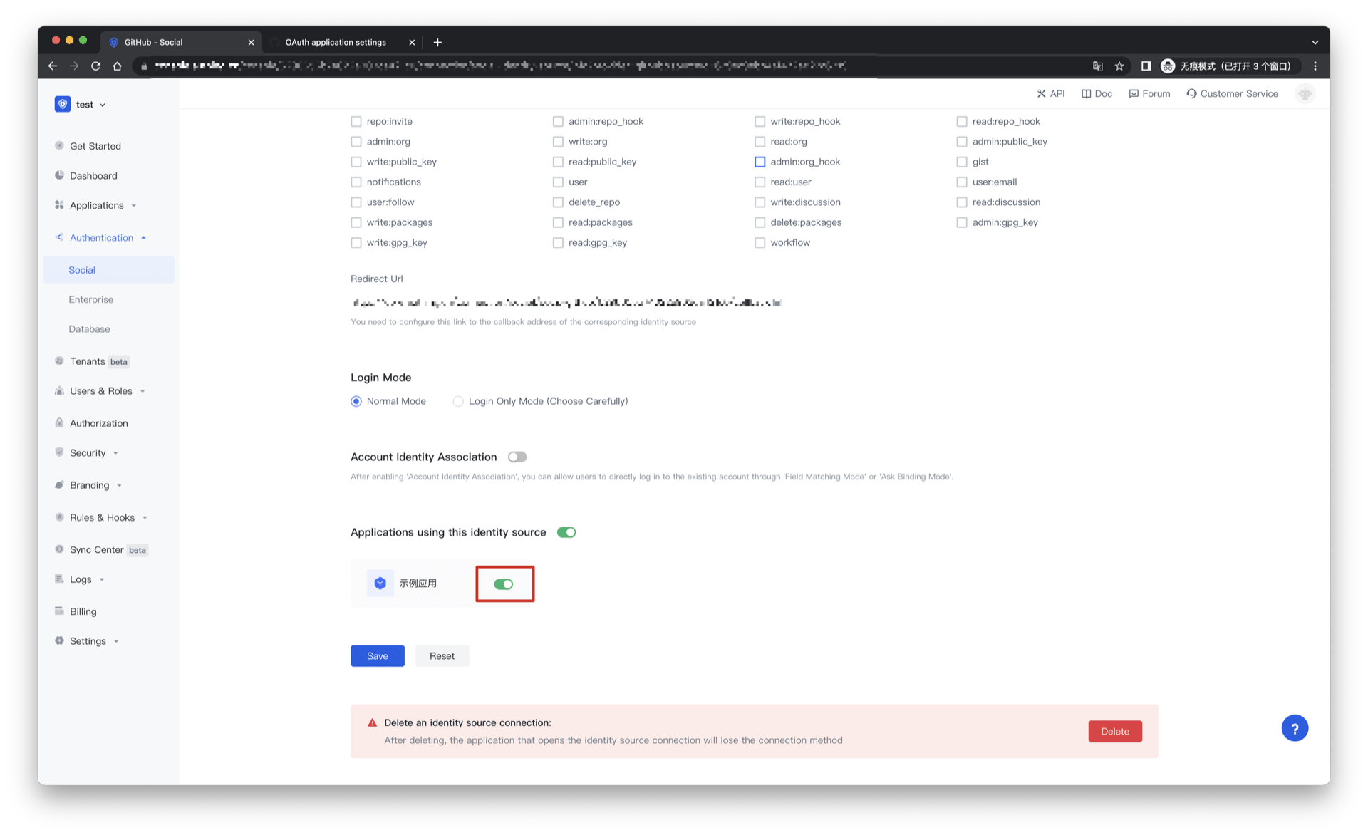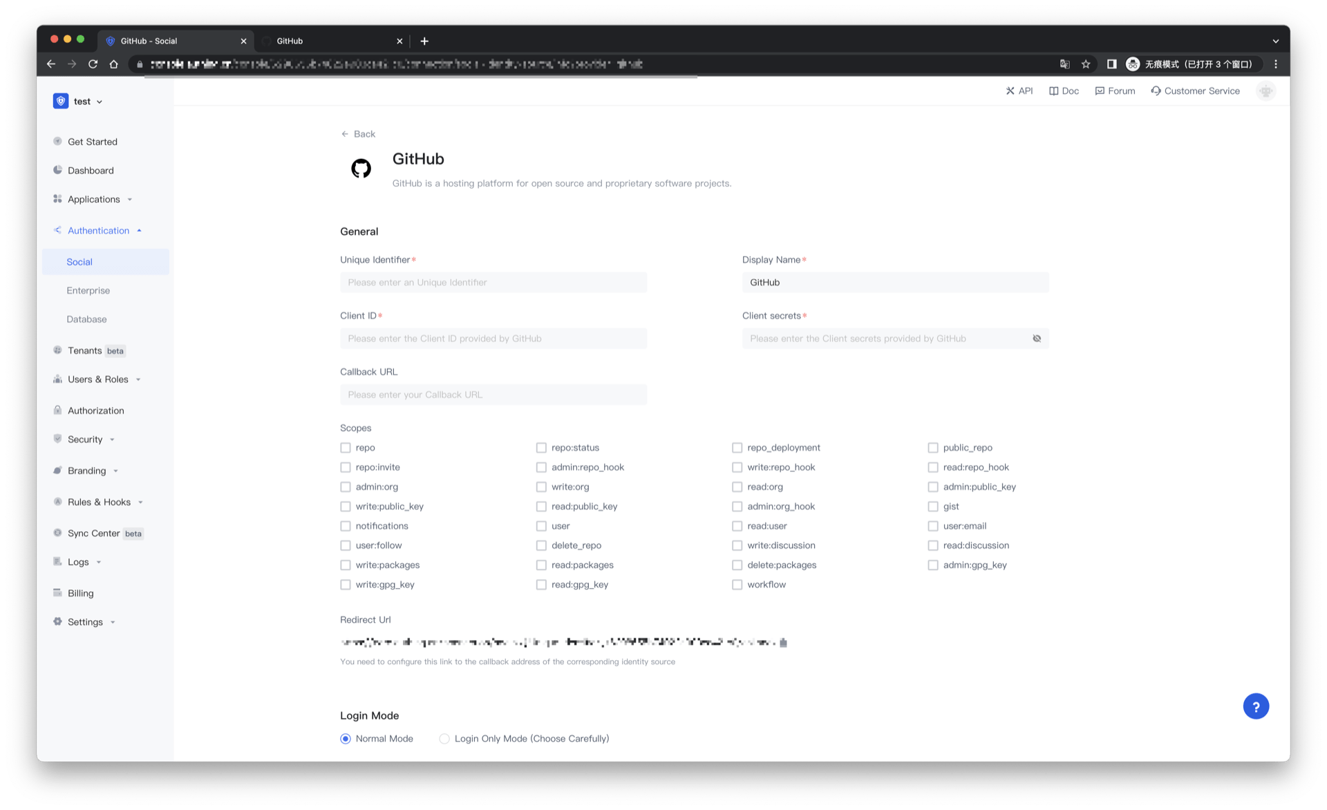 2.3 Please configure the relevant field information on the "Social" - "Github" page of the Authing console.