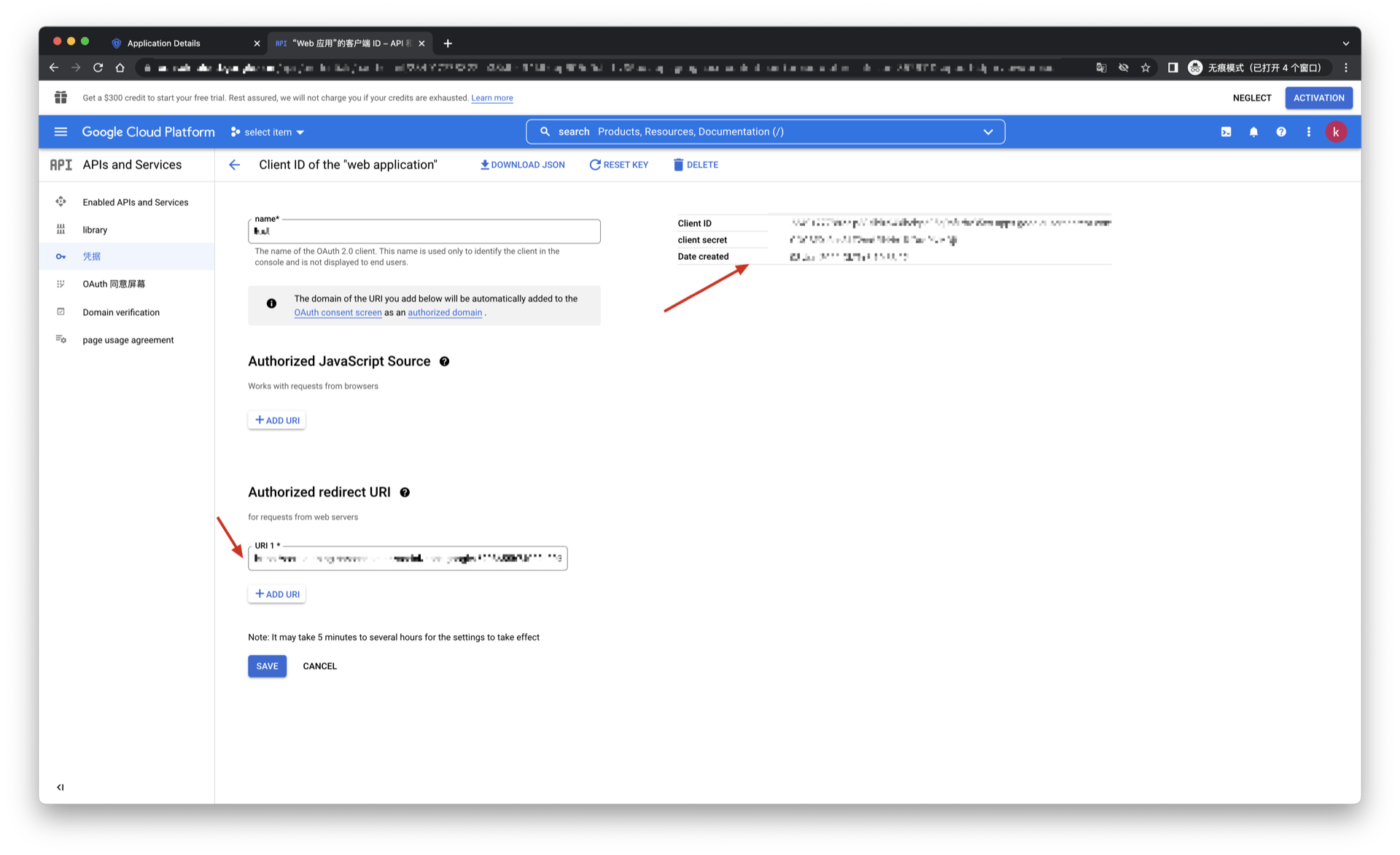 - After the creation is successful, on the next page you can get the Client ID and Client Secret of this application, which you need to record.