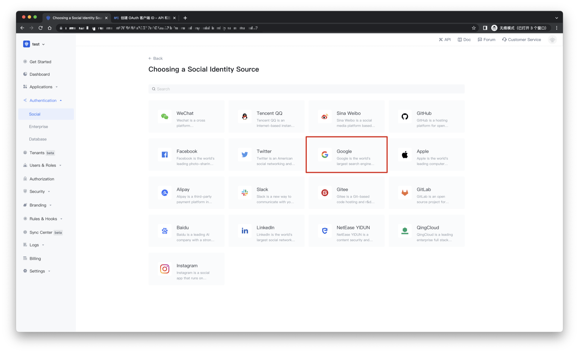2.2 Please click the "Google" identity source button on the "Create Connection" - "Choosing a Social Identity Source" page of the Authing console to enter the "Google Login Mode" page.