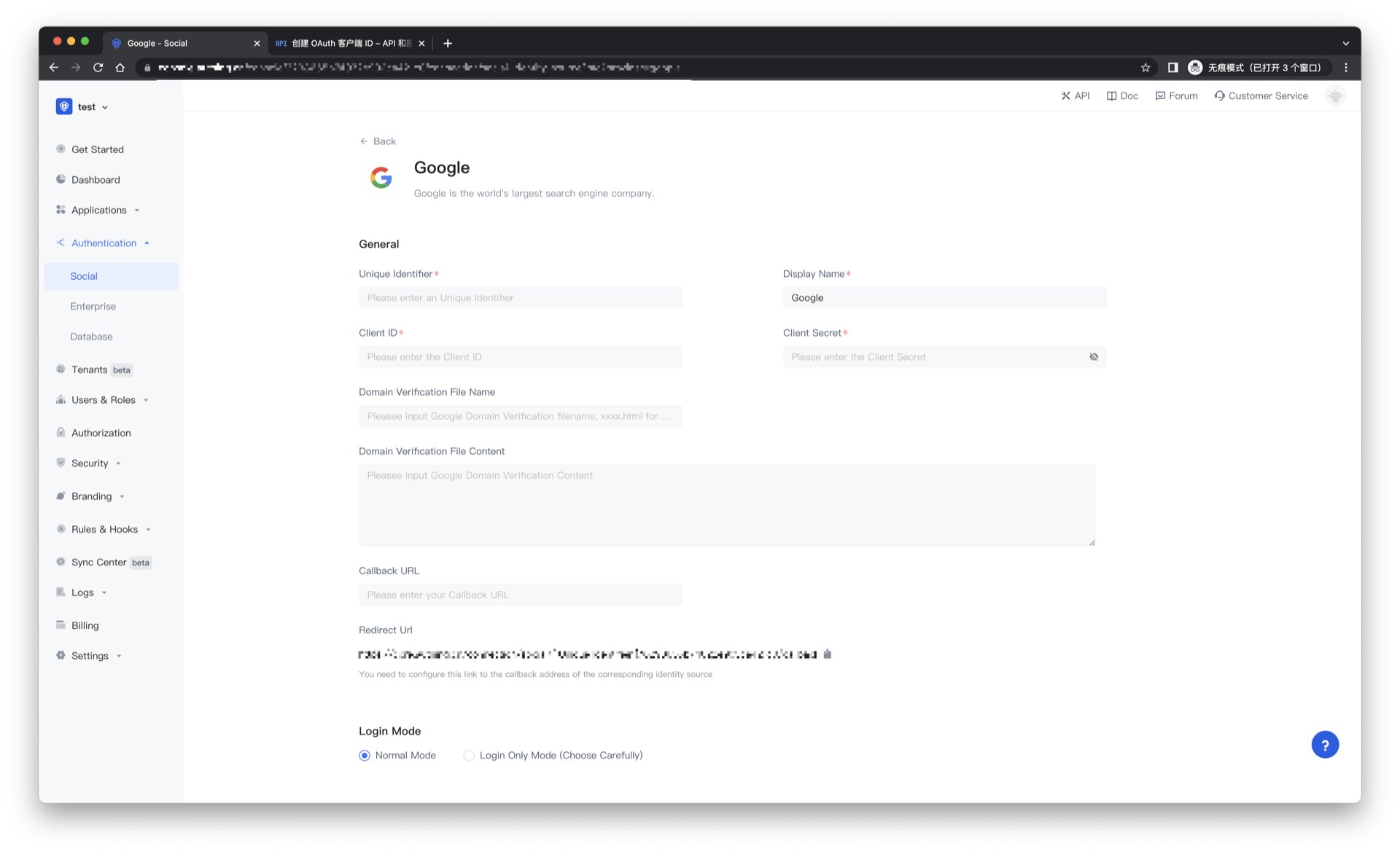 2.3 Please configure the relevant field information on the "Social" - "Google" page of the Authing console.