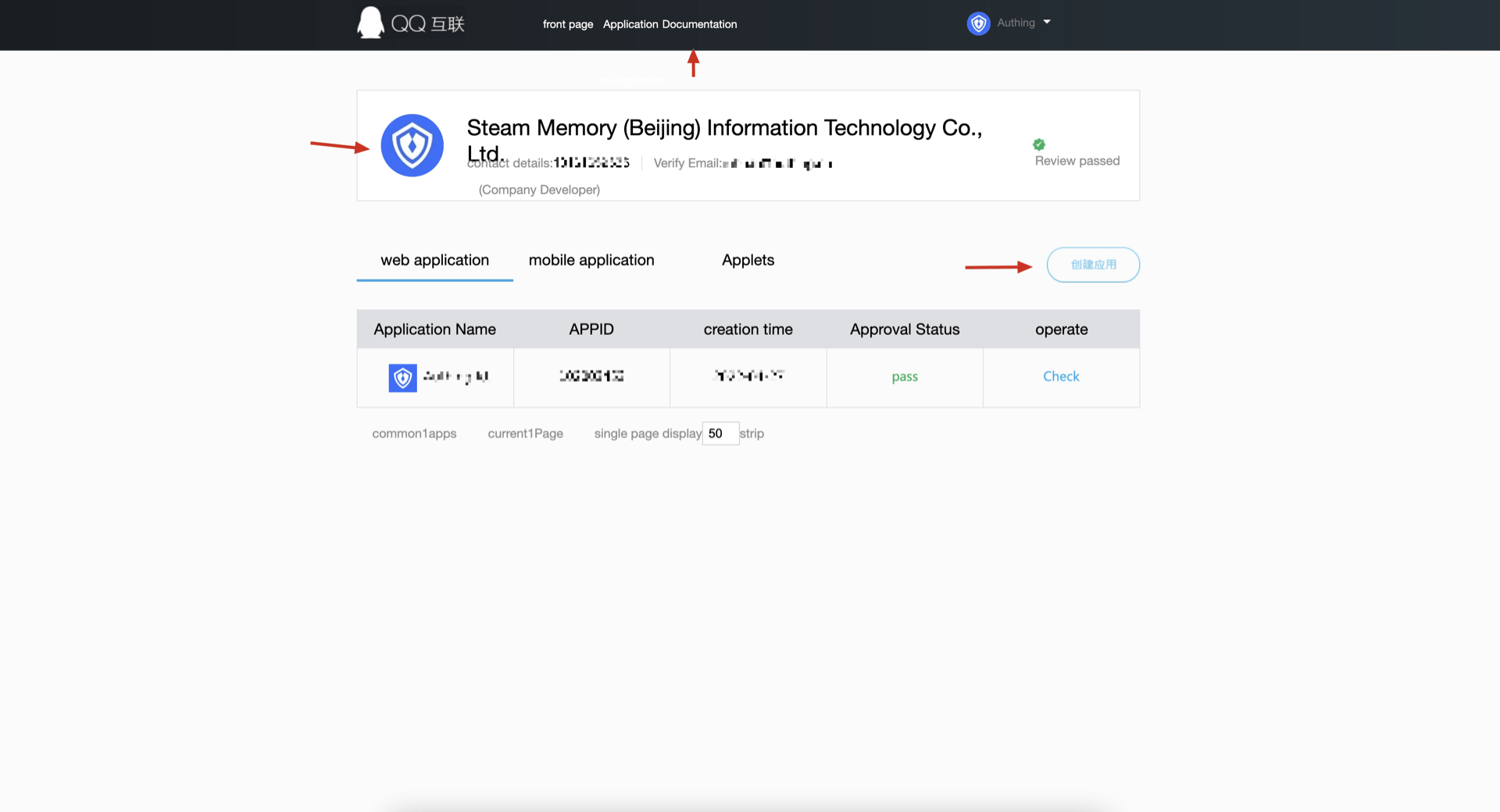 Click your personal QQ avatar at the top left of the page to complete the registration and initiate an audit, and then click "Website Application" and "Create Application" to create a website application that uses QQ to log in. If you encounter any problems during the process, please refer to the official QQ "Documentation" at the top of the page.