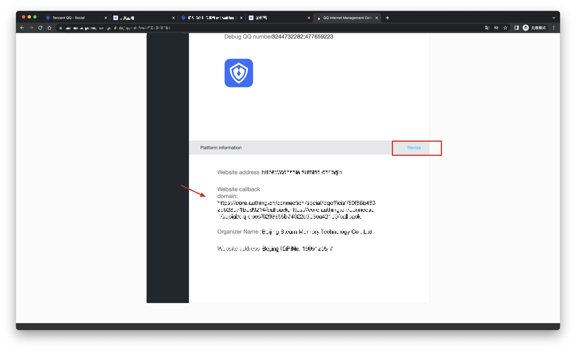 After creating the Tencent QQ identity source on the Authing console, you need to configure the callback address to the website callback domain in the platform information on the QQ Internet open platform.