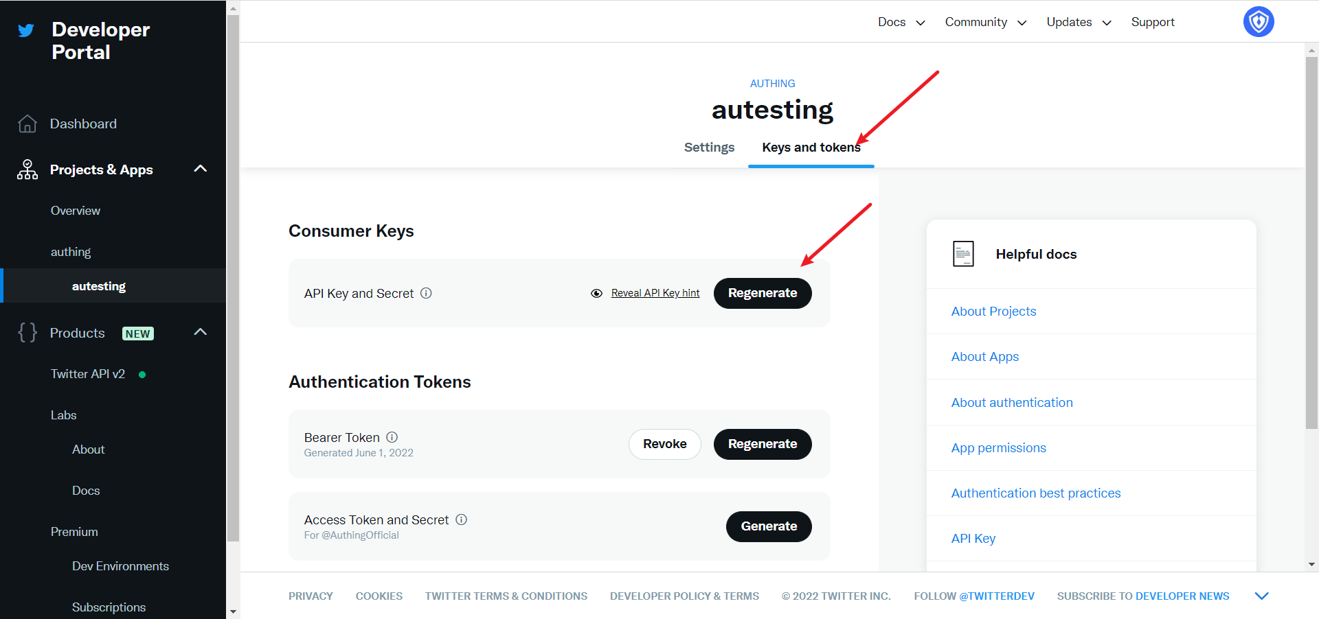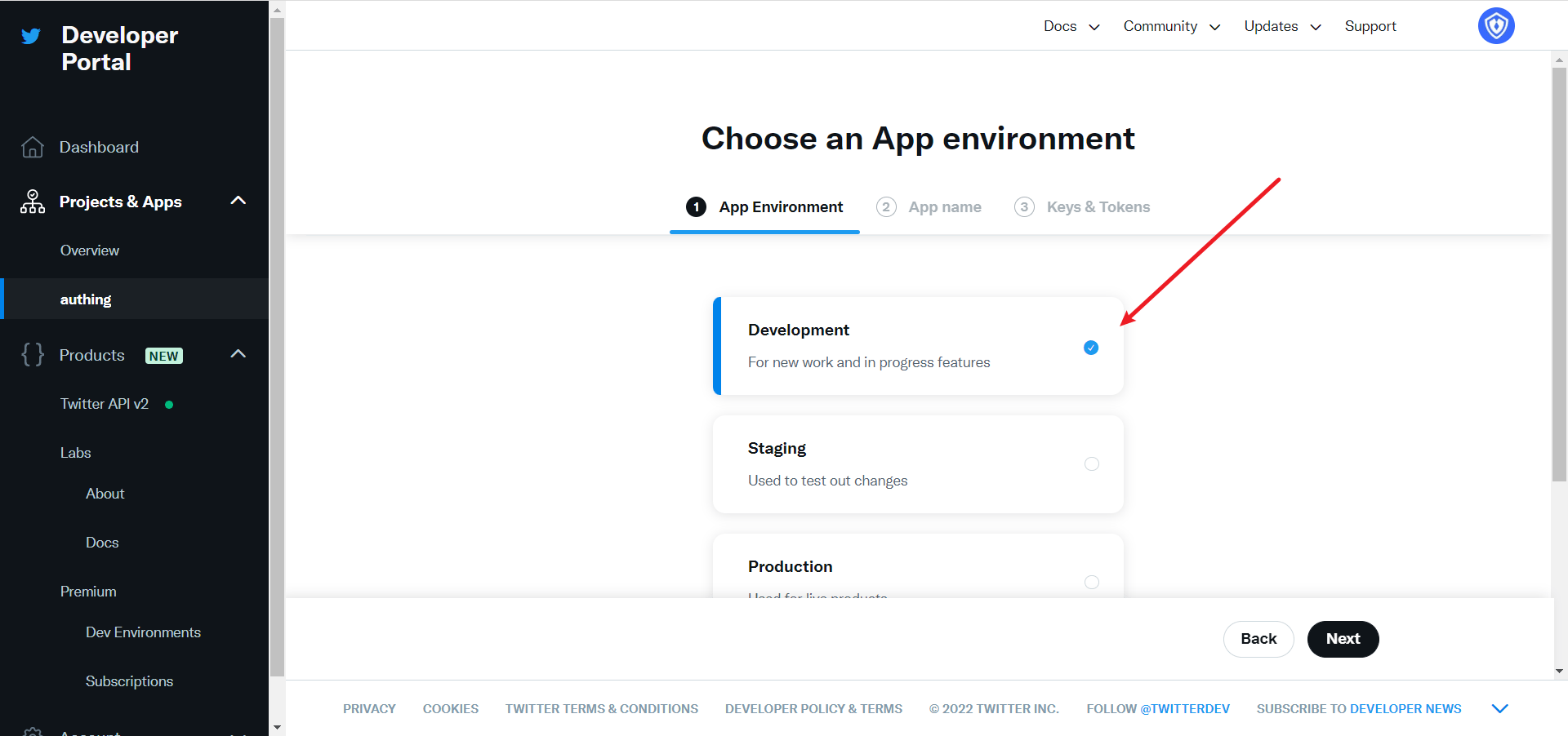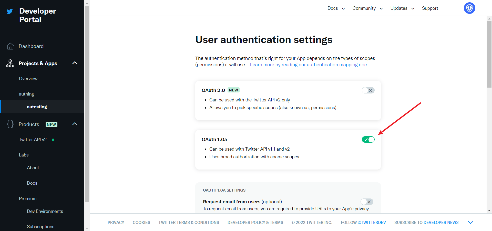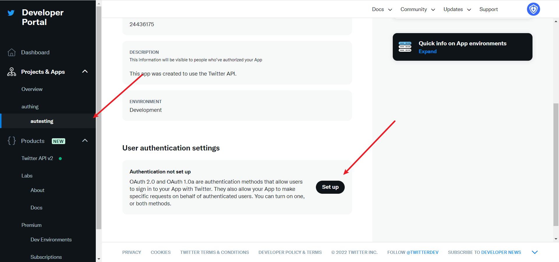 In the Twitter created project, select the app you just created, scroll down to the bottom and under the User authentication settings section, click the Set Up button to enter the authentication settings page