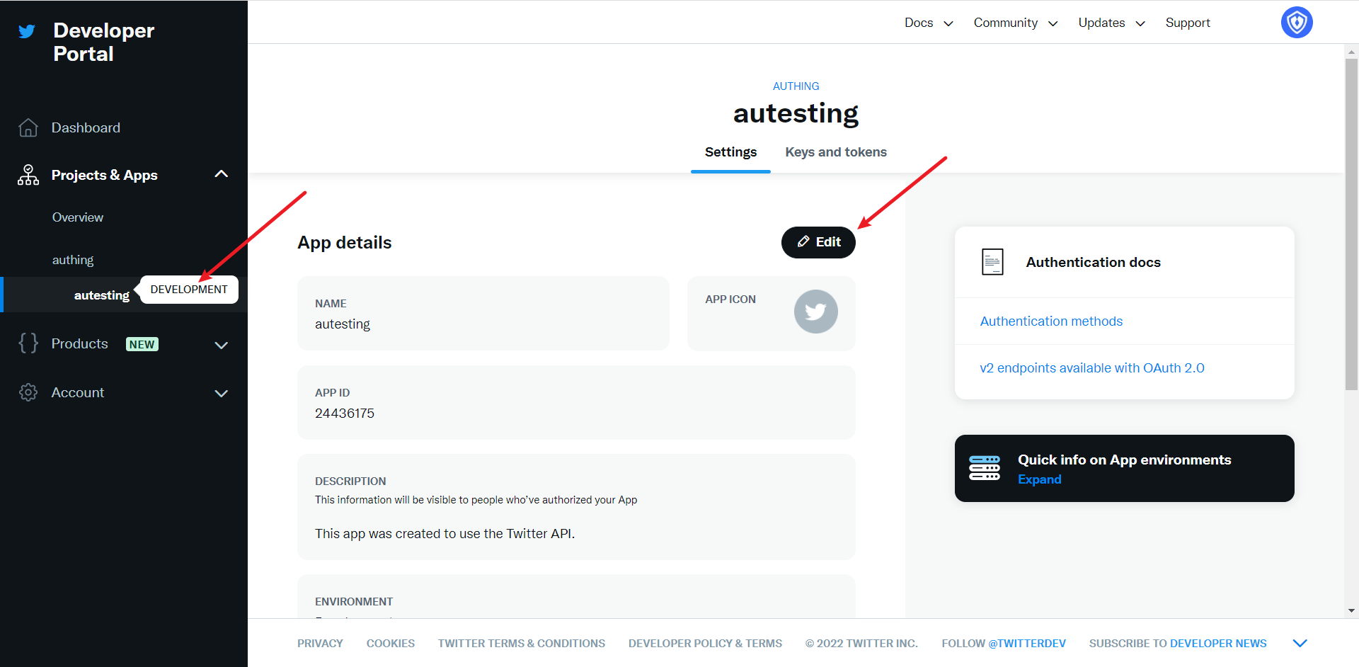 When you're done configuring the app, go back to the app settings page and click Edit to switch the app environment to Production.