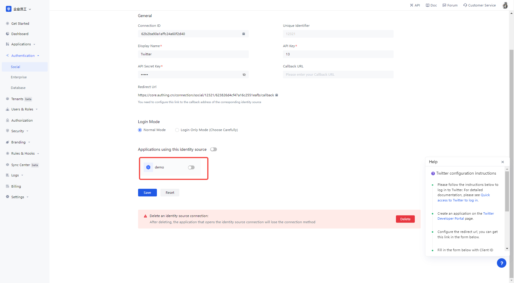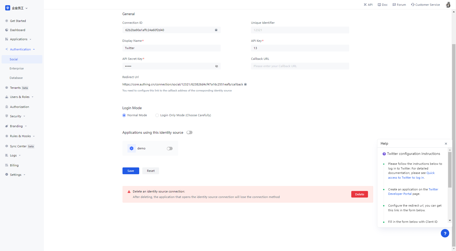 2.3 Please configure the relevant field information on the Social Identity Source - Twitter page in the Authing Console.