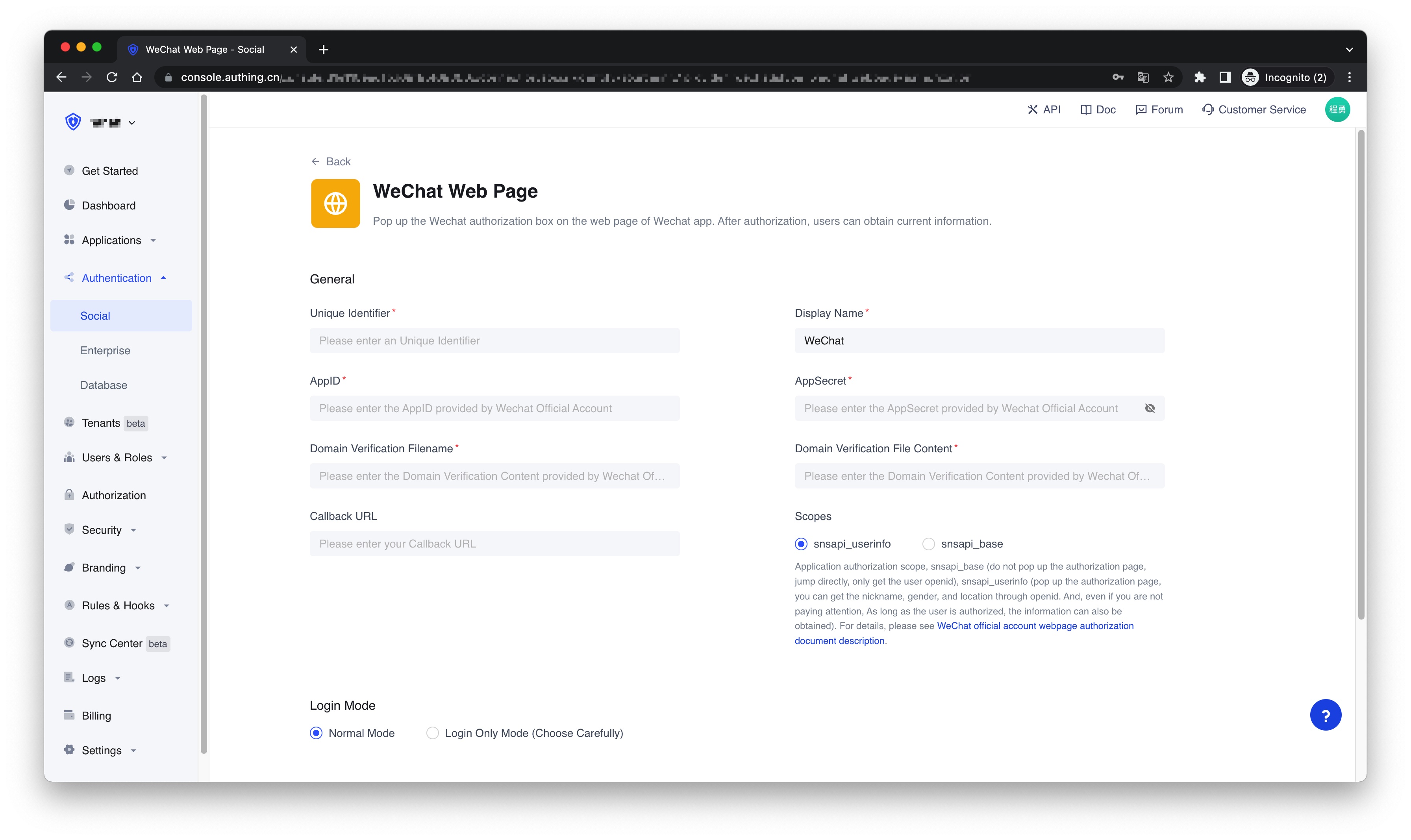 ¶ Step 2: Configure the WeChat web page authorization application in the Authing Console
