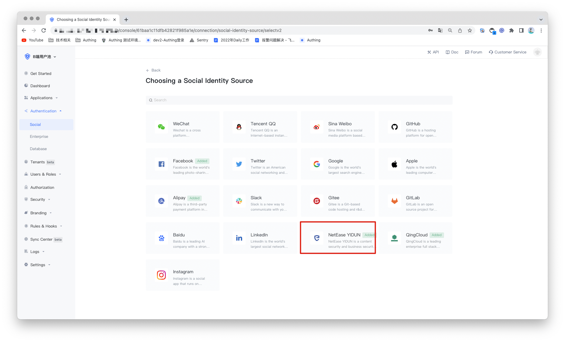 2.1 On the "Social Identity Source" page of the Authing Console, click the "Create Social Identity Source" button to enter the "Select Social Identity Source" page.