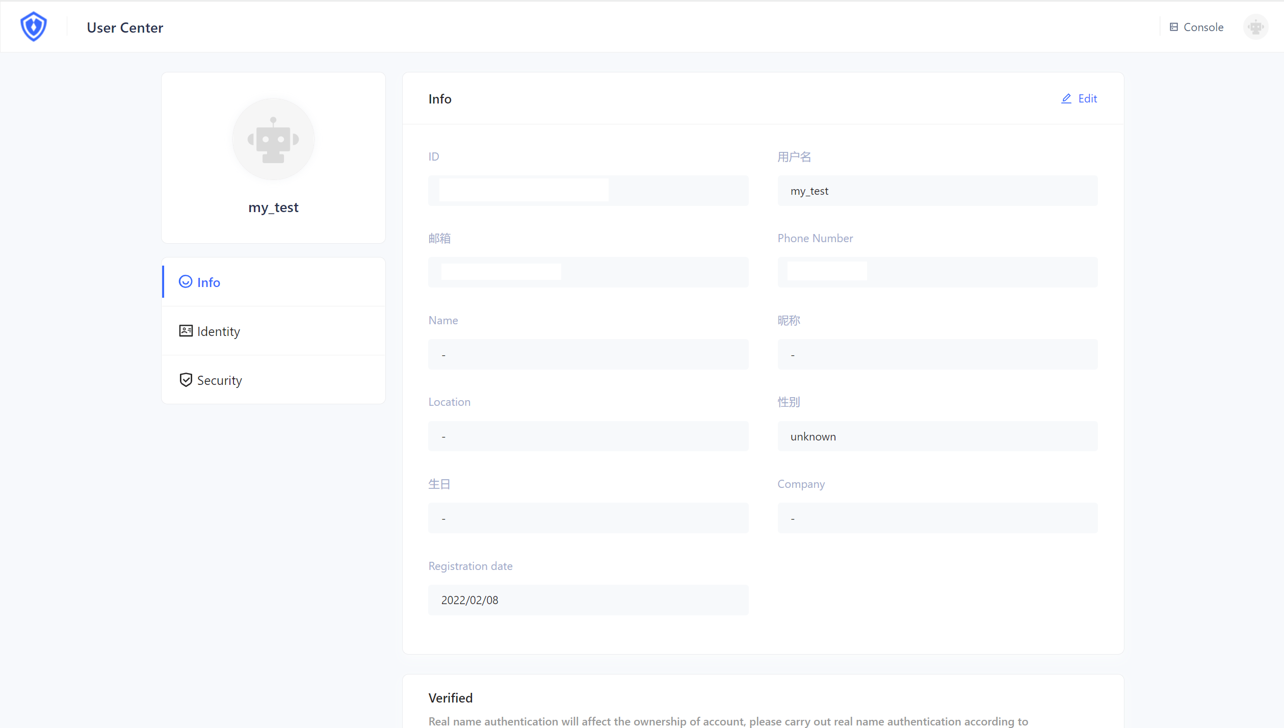 There will be a user personal center, you can feel it by clicking here (opens new window), the address is https://<YOUR_DOMAIN>.authing.cn/u: