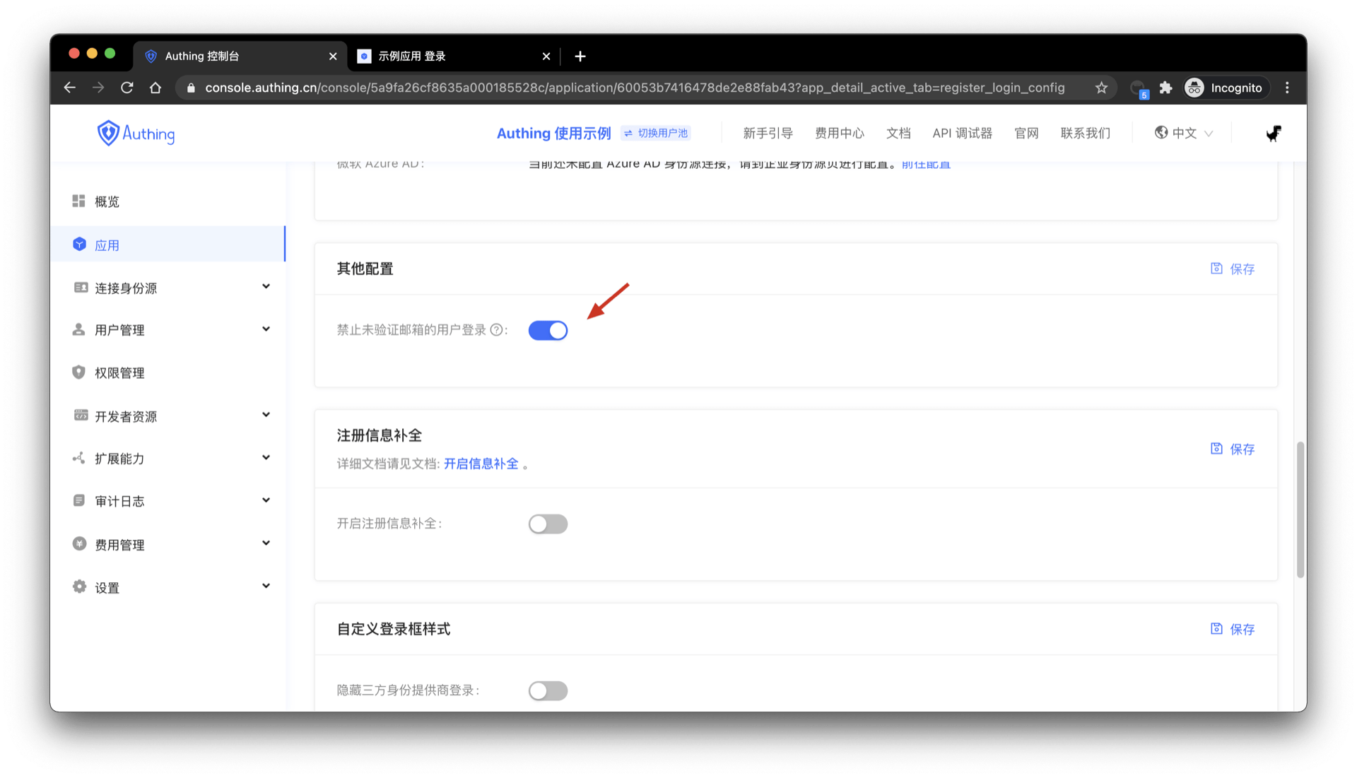 By default, accounts with unverified email can log in, and you can also modify the configuration in the application details: