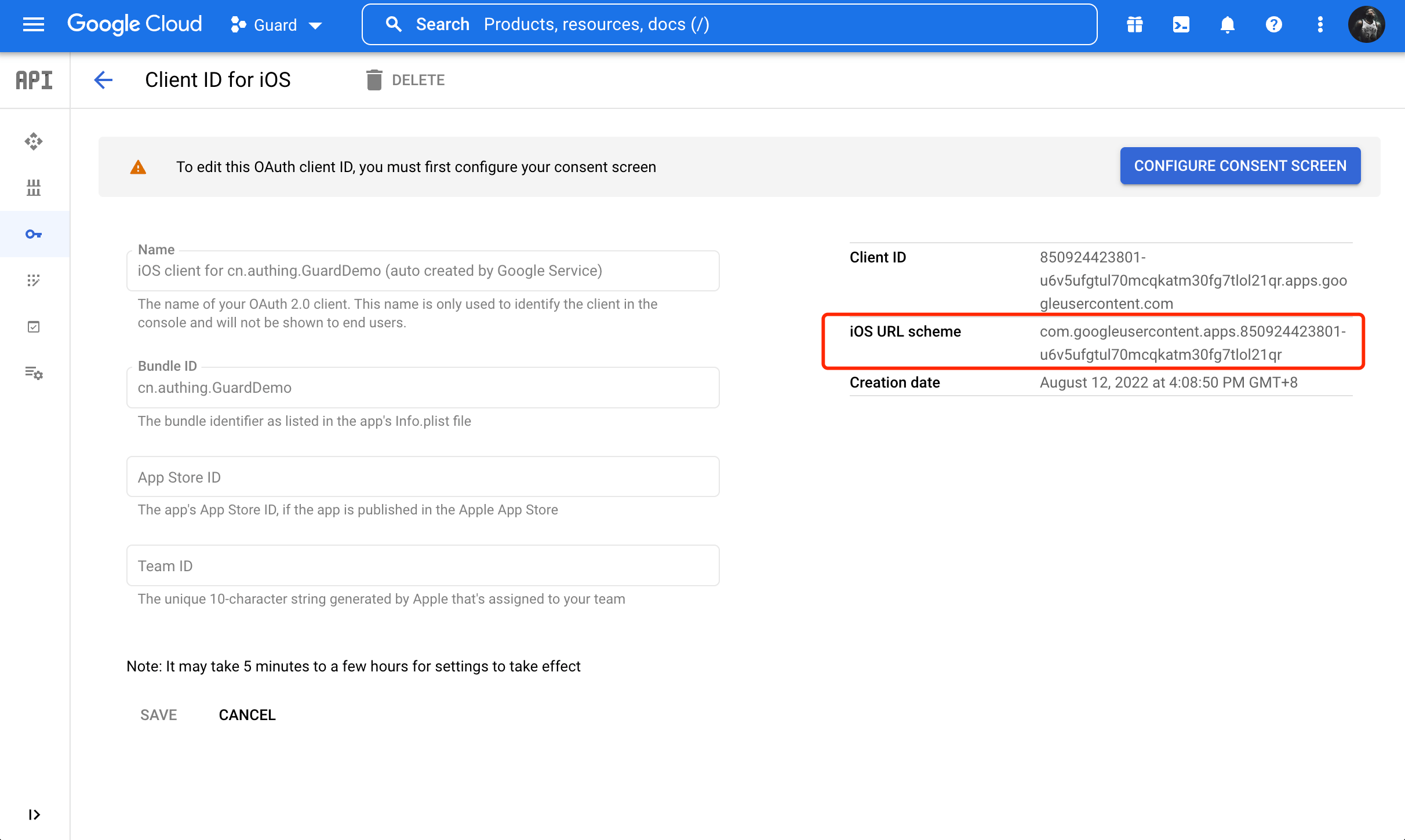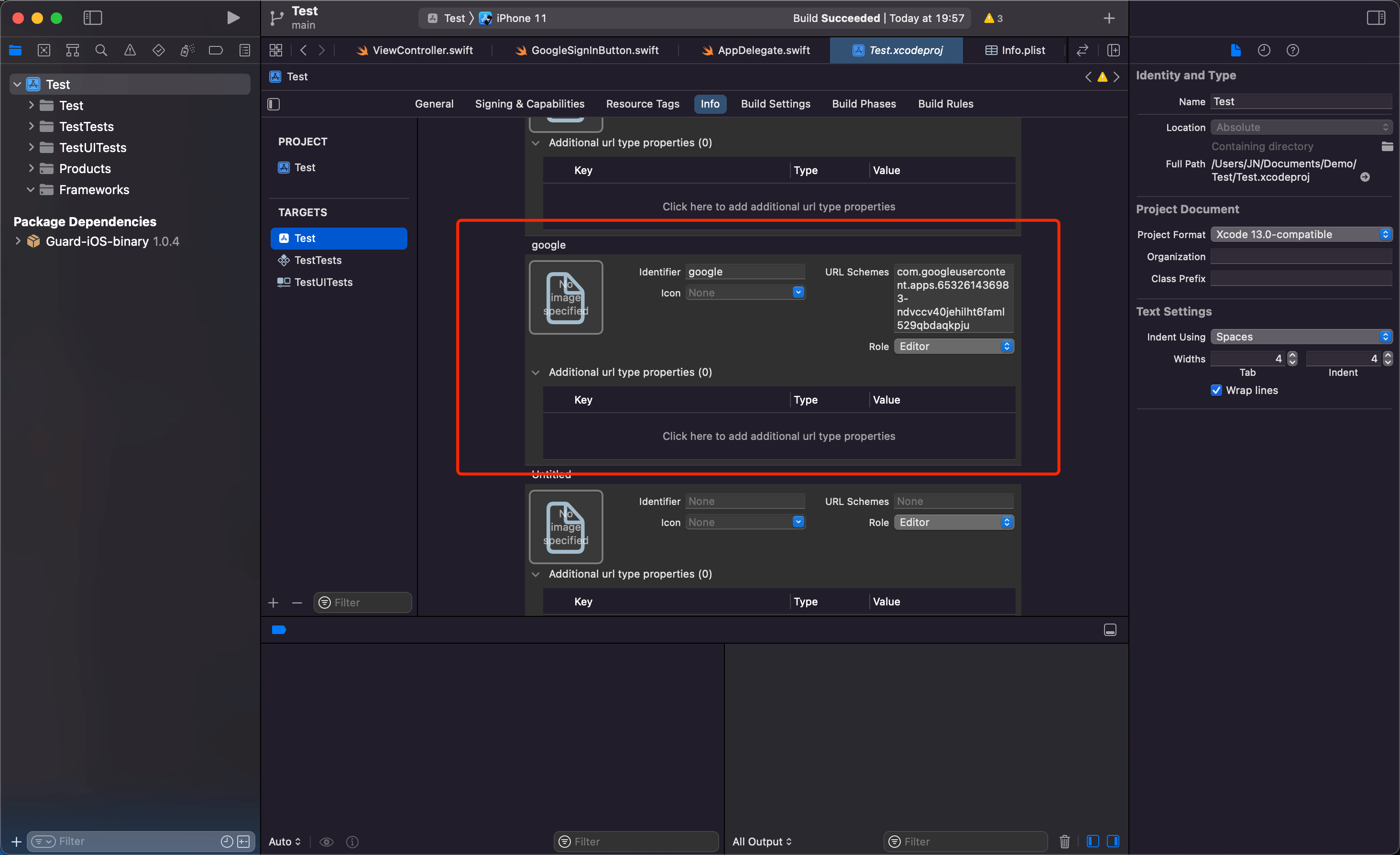 - URL Schemes Add iOS URL scheme of Google console.