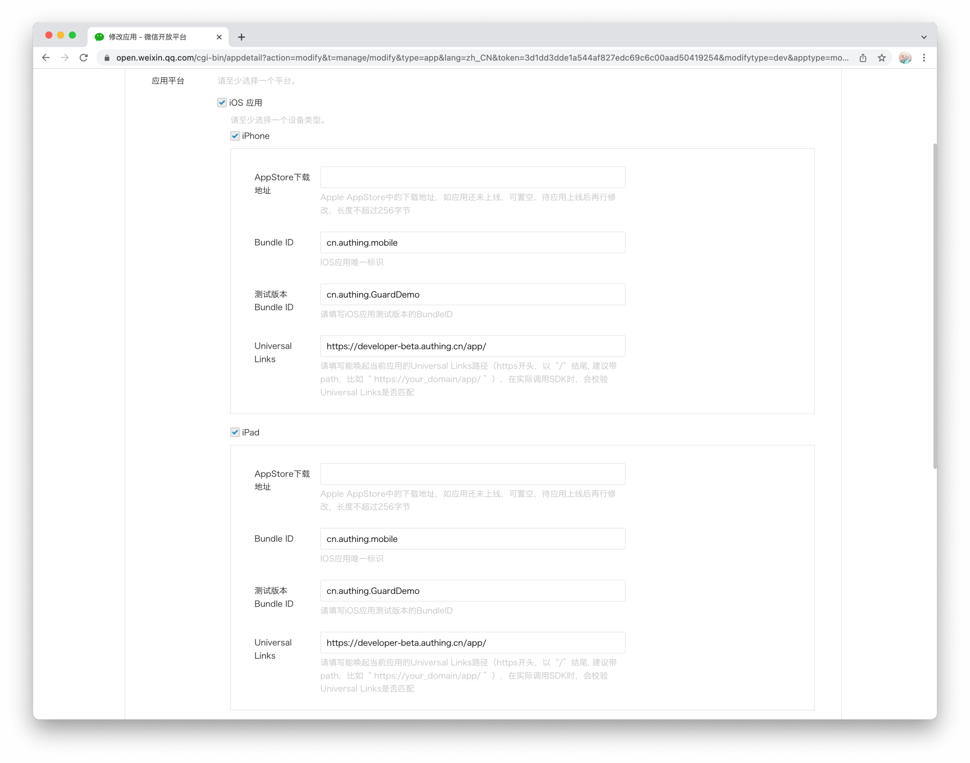 The first parameter is the WeChat App id; the second parameter is iOS Universal Link (opens new window)