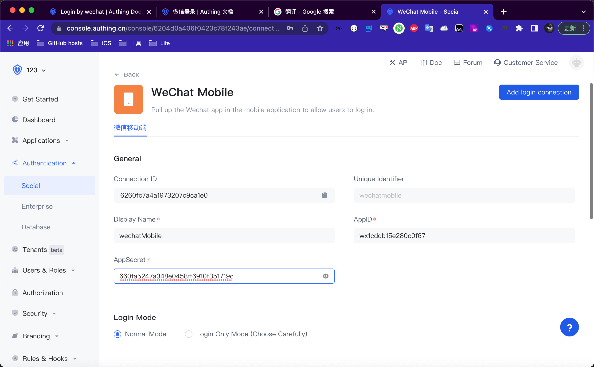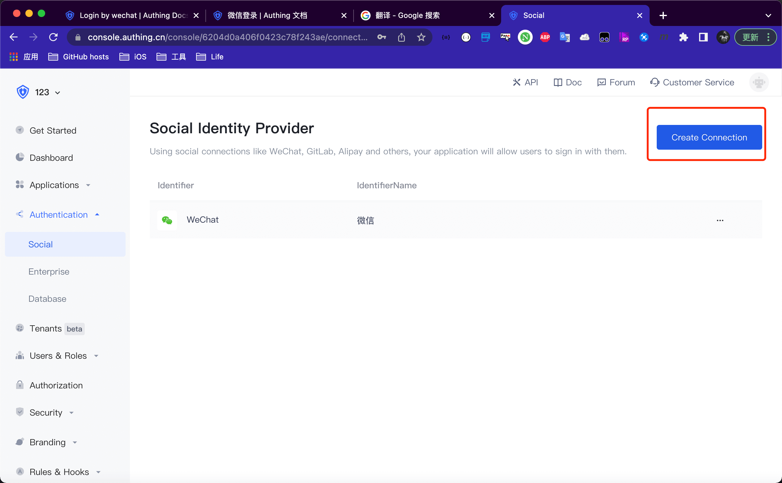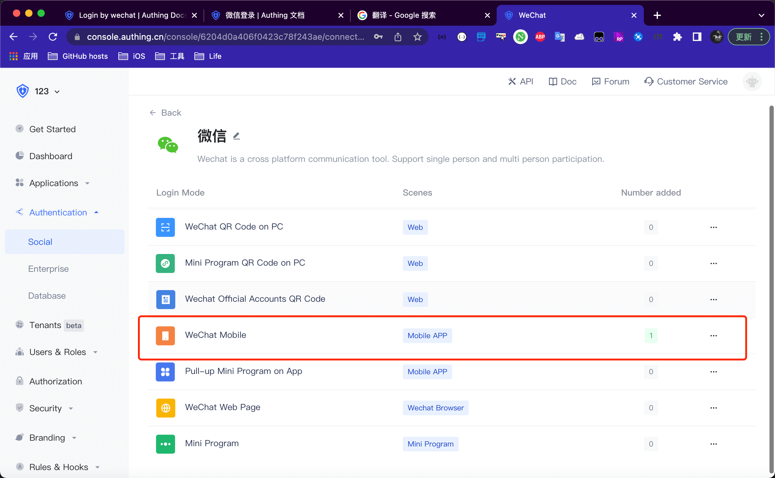 - Click 'Authentication' on the left sidebar and choose 'Social', then click 'Wechat'