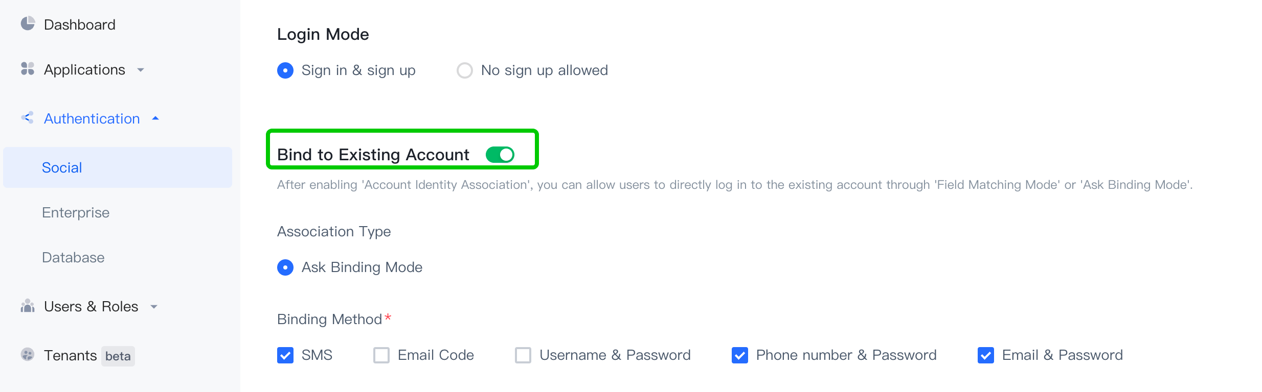 If you have selected the Login Mode and enabled the Bind to Existing Account function, use the following API to build the subsequent business process: