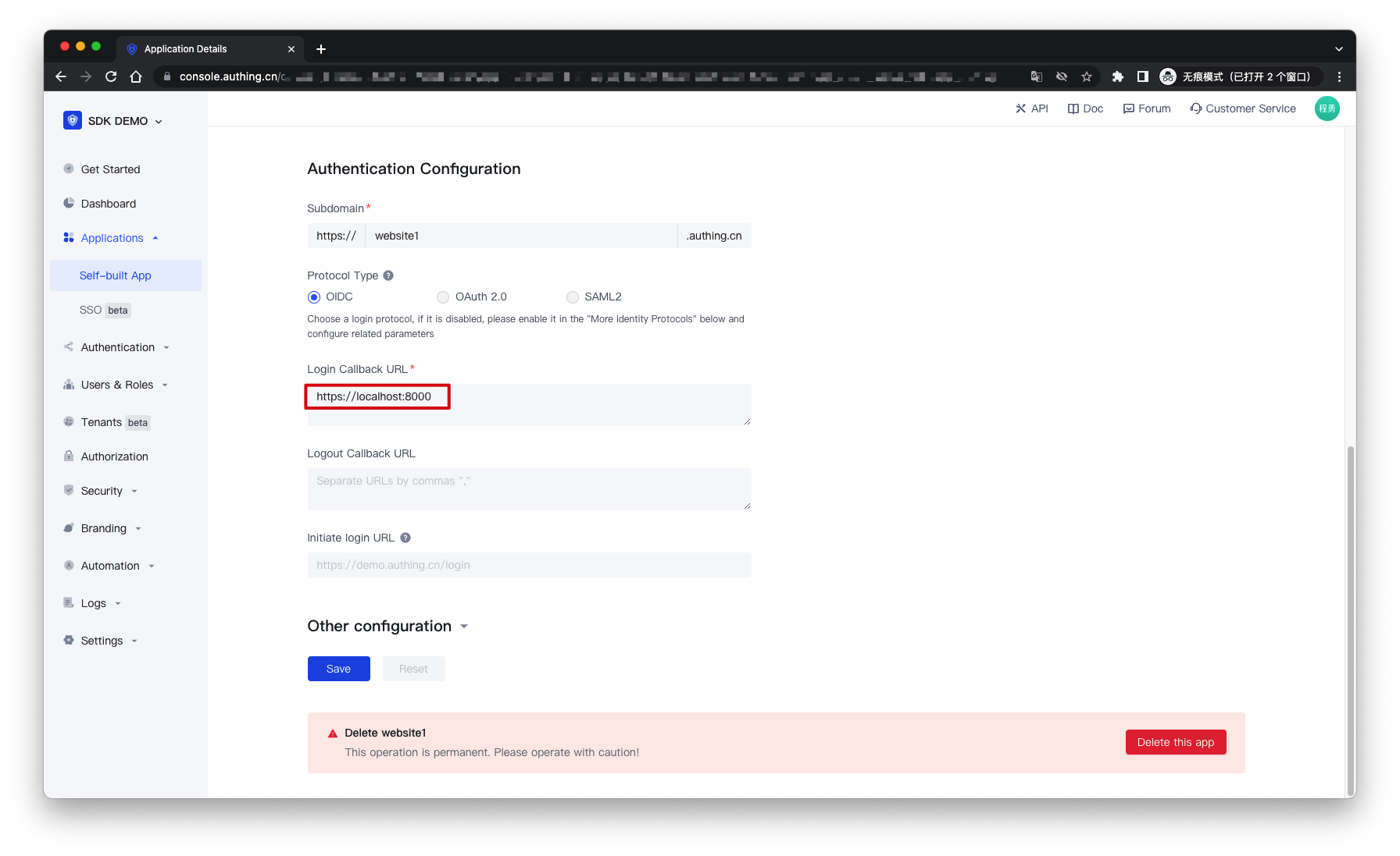 In order to use the Authing Browser SDK, you need to fill in the App ID, domain, callback url and other parameters, as shown in the following example: