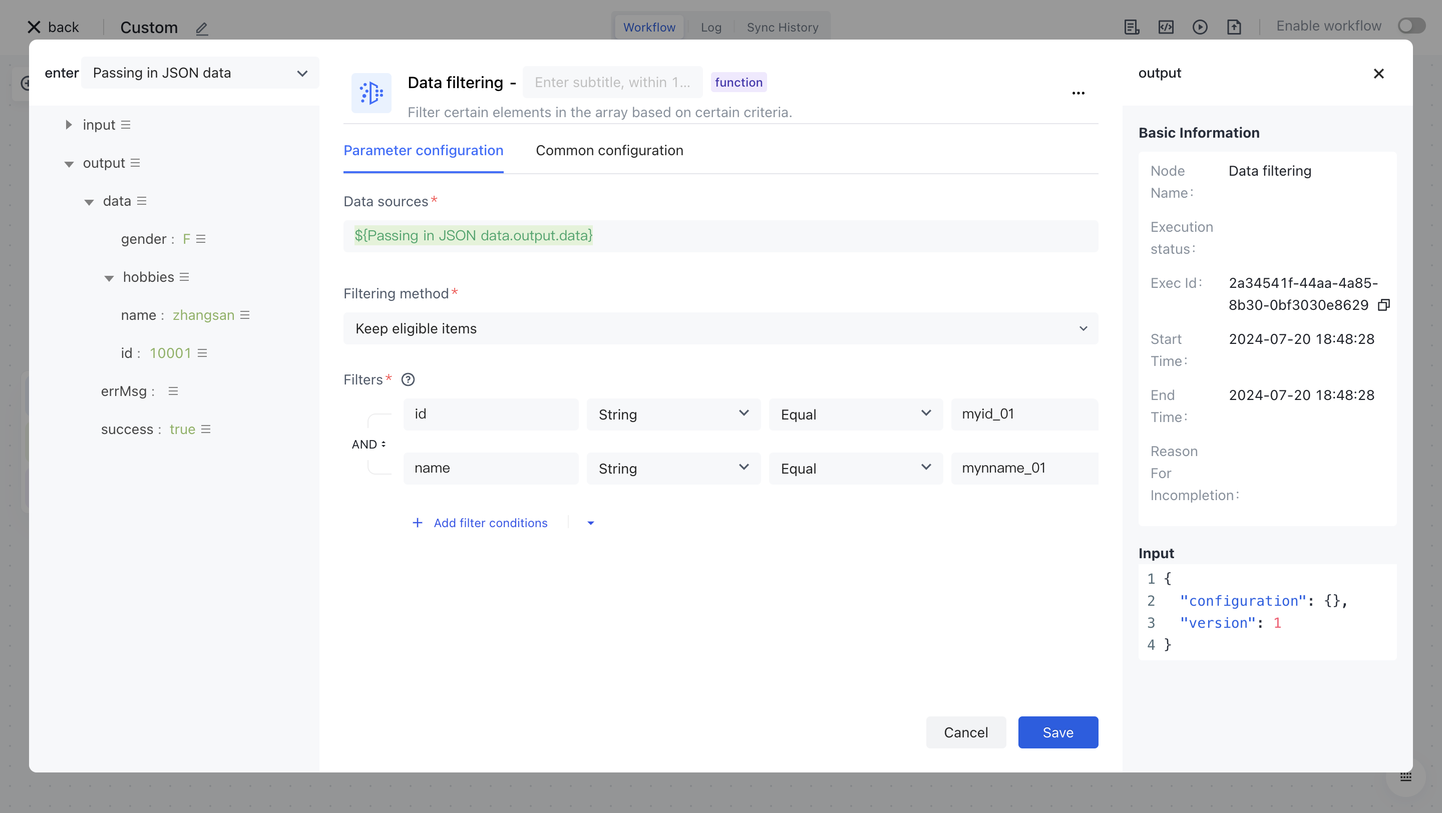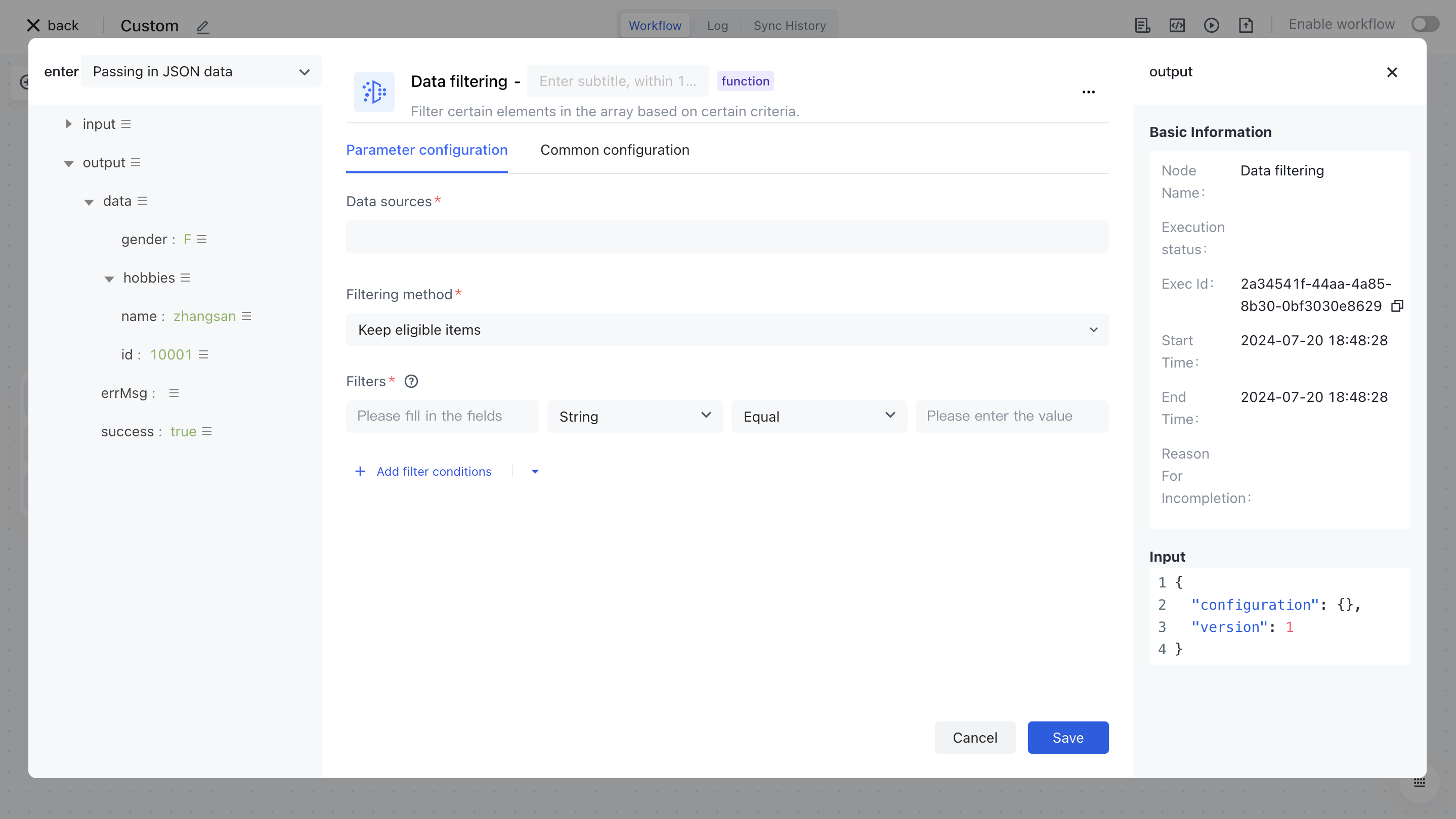 • Filtering methods include retaining items that meet the criteria and retaining items that do not meet the criteria. "Preserving eligible items" refers to data items that meet the following filtering conditions being retained in the node's output data; "Retain items that do not meet the following filtering conditions" means that data items that do not meet the following filtering conditions will be retained in the node's output data;