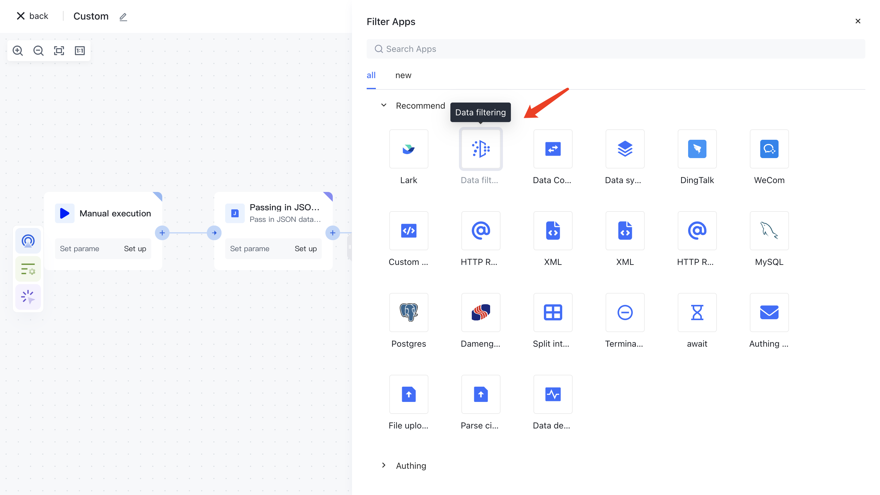 On the Add Node page, enter the "Data Filtering" keyword for application filtering, or find the "Data Filtering" node in the "Data Processing" category.