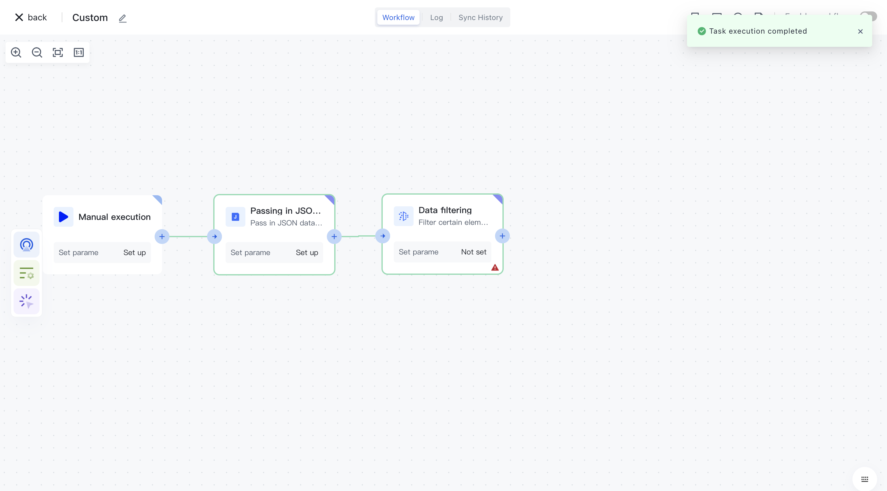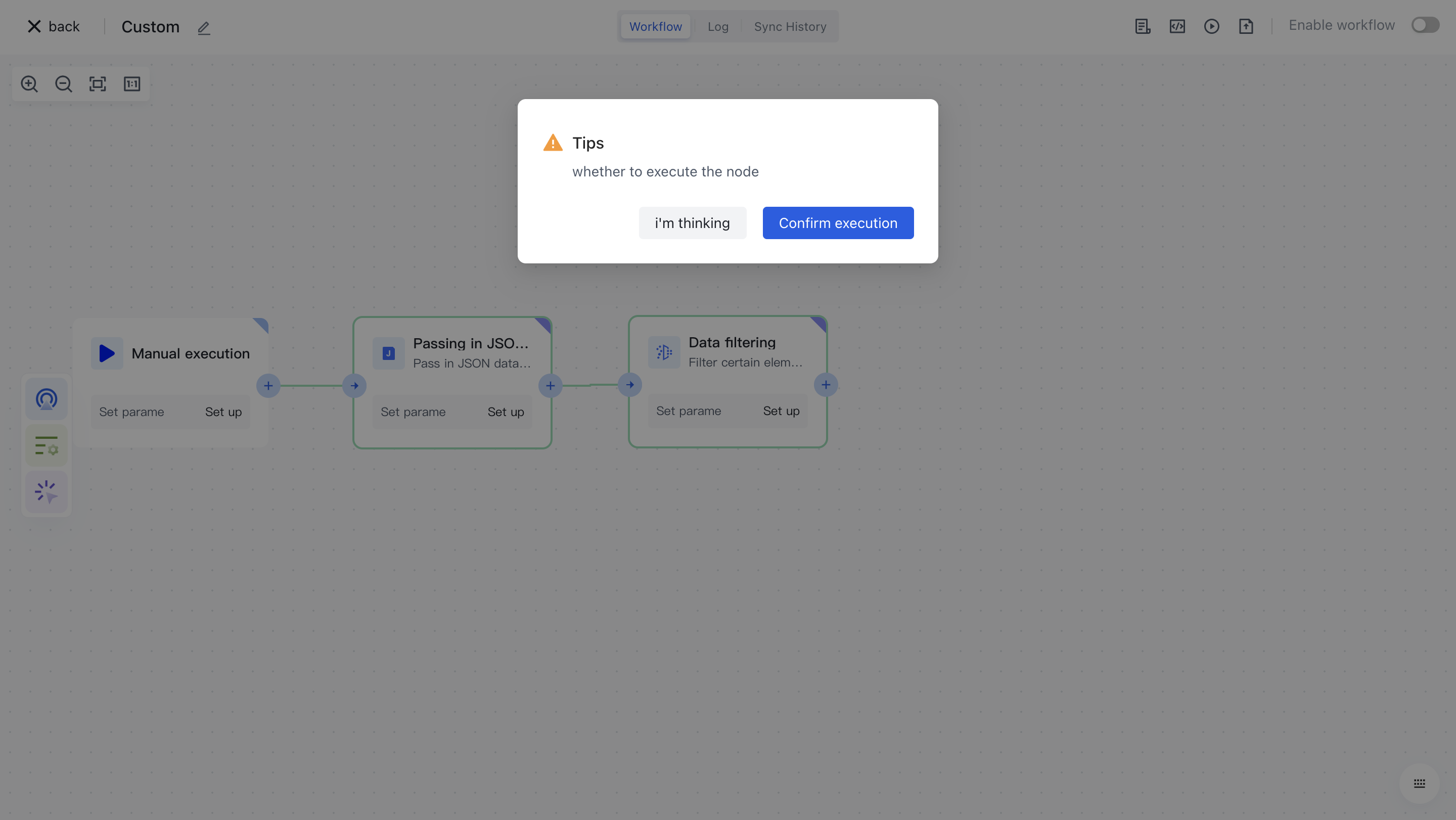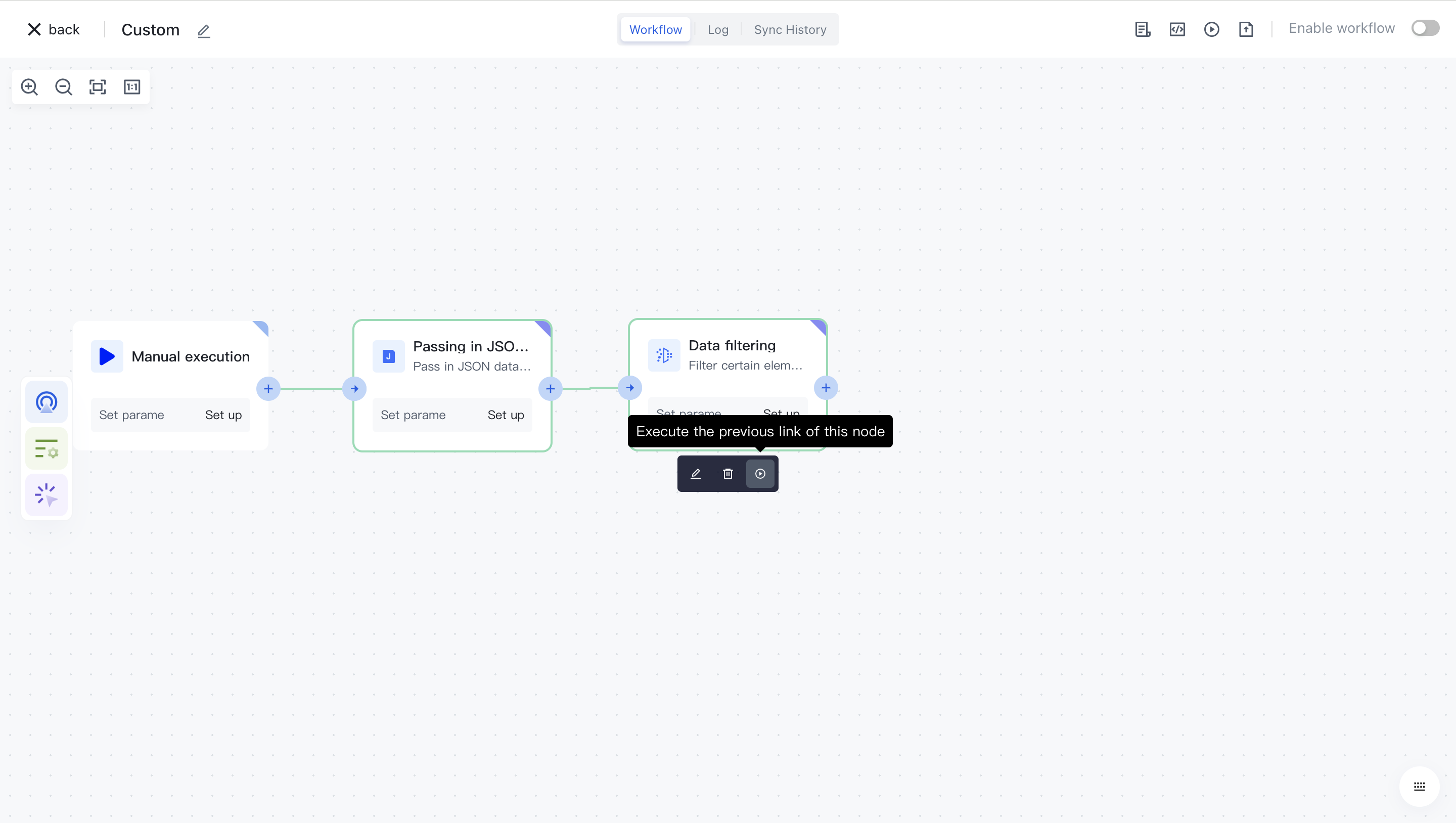 Click the "Execute the previous link of this node" button under the node to start testing the workflow node link.