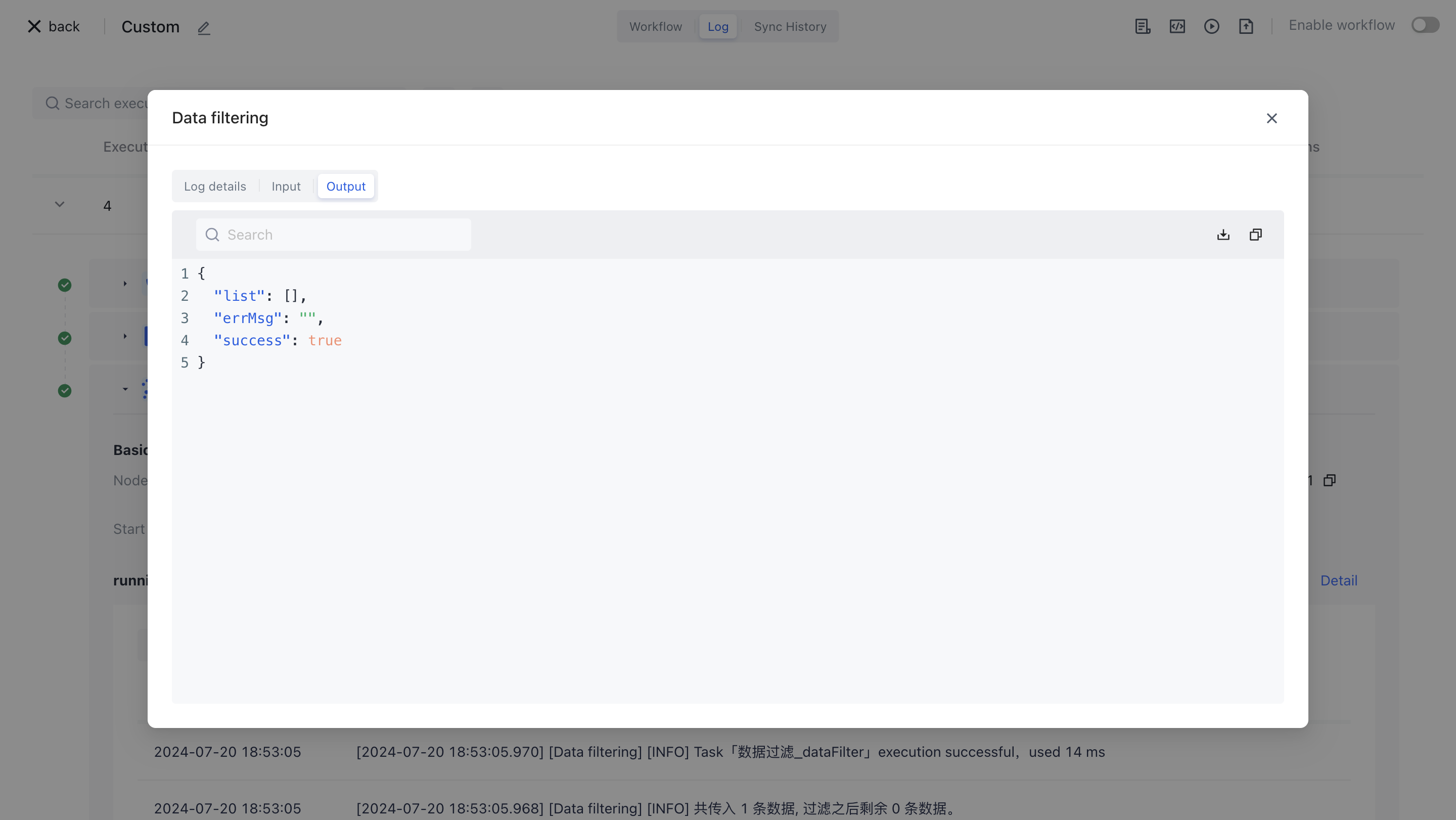 After successful execution, click on the "Run Log" column, then click on the latest "Execution Batch" and the expand button on the left side of the "Data Filtering" node to view the node execution results.