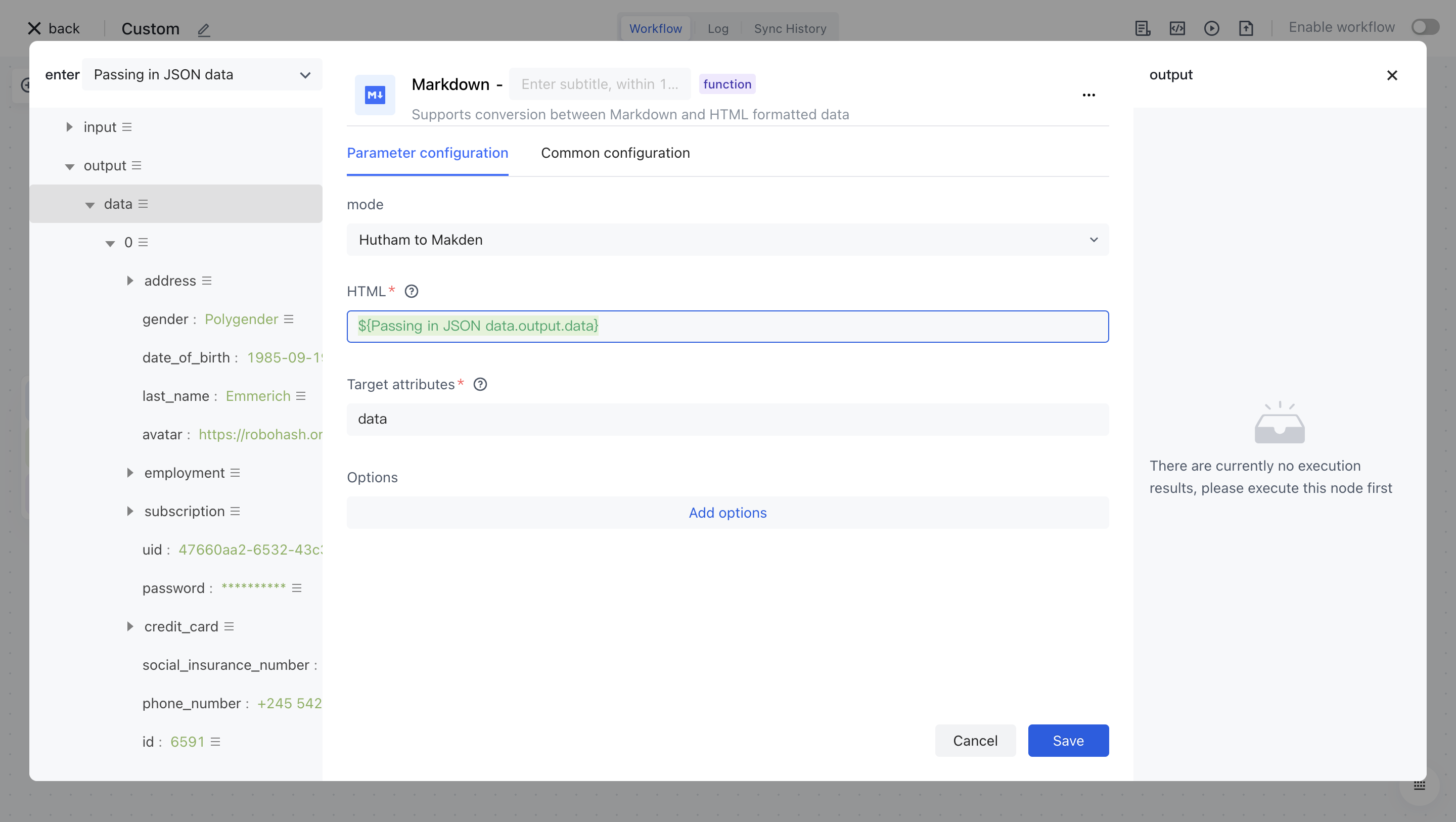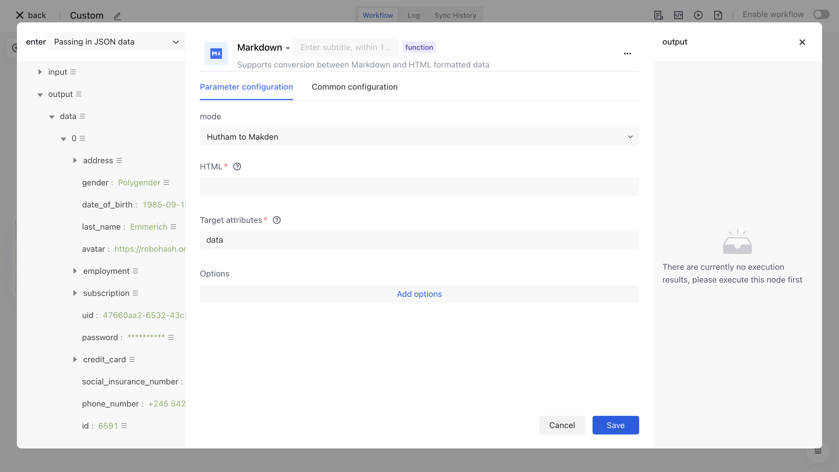 The Markdown node is mainly used to convert source data HTML into Markdown and Markdown into HTML.