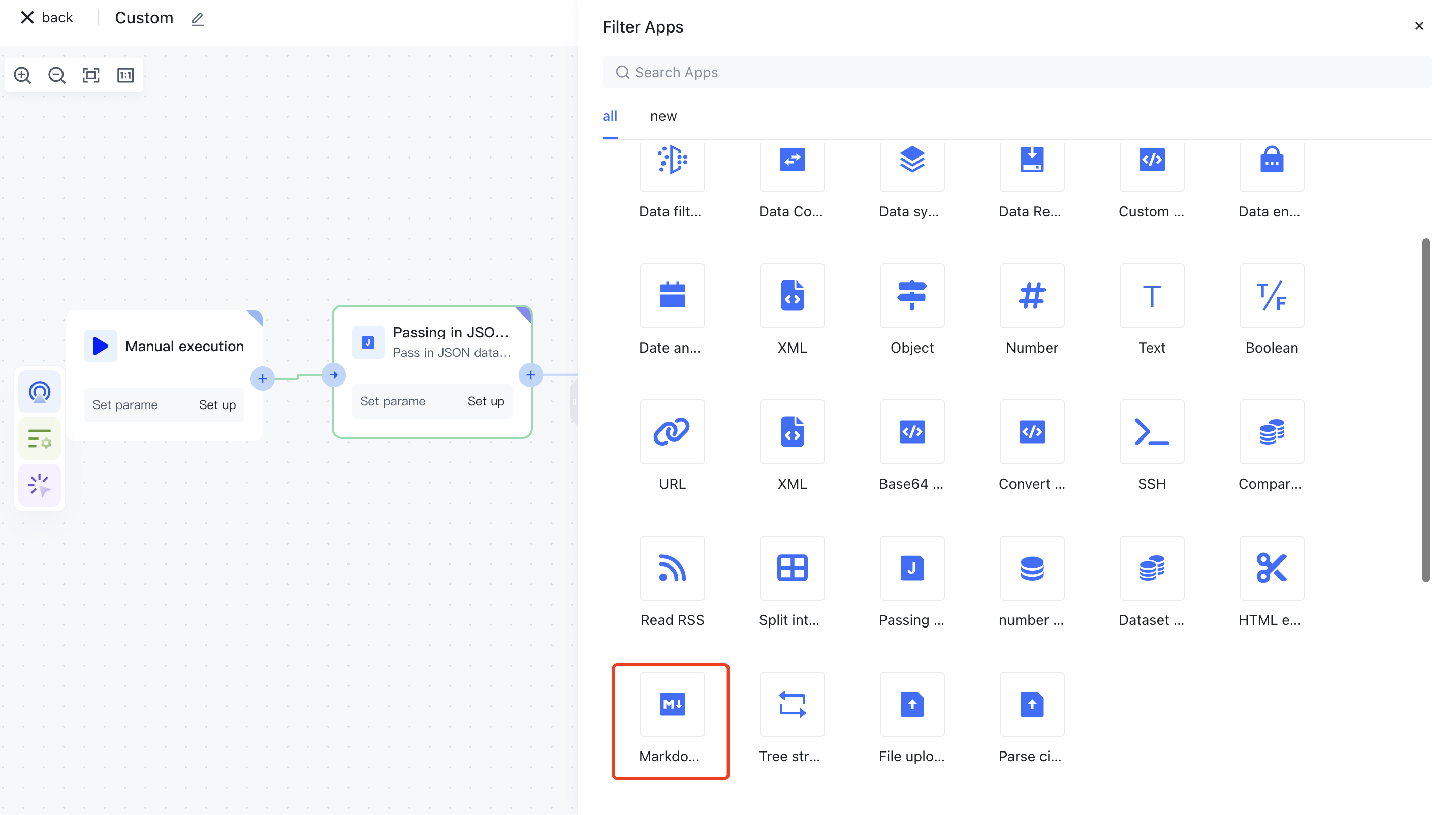 On the Add Node page, find the "Markdown" application node in the "Data Processing" category.