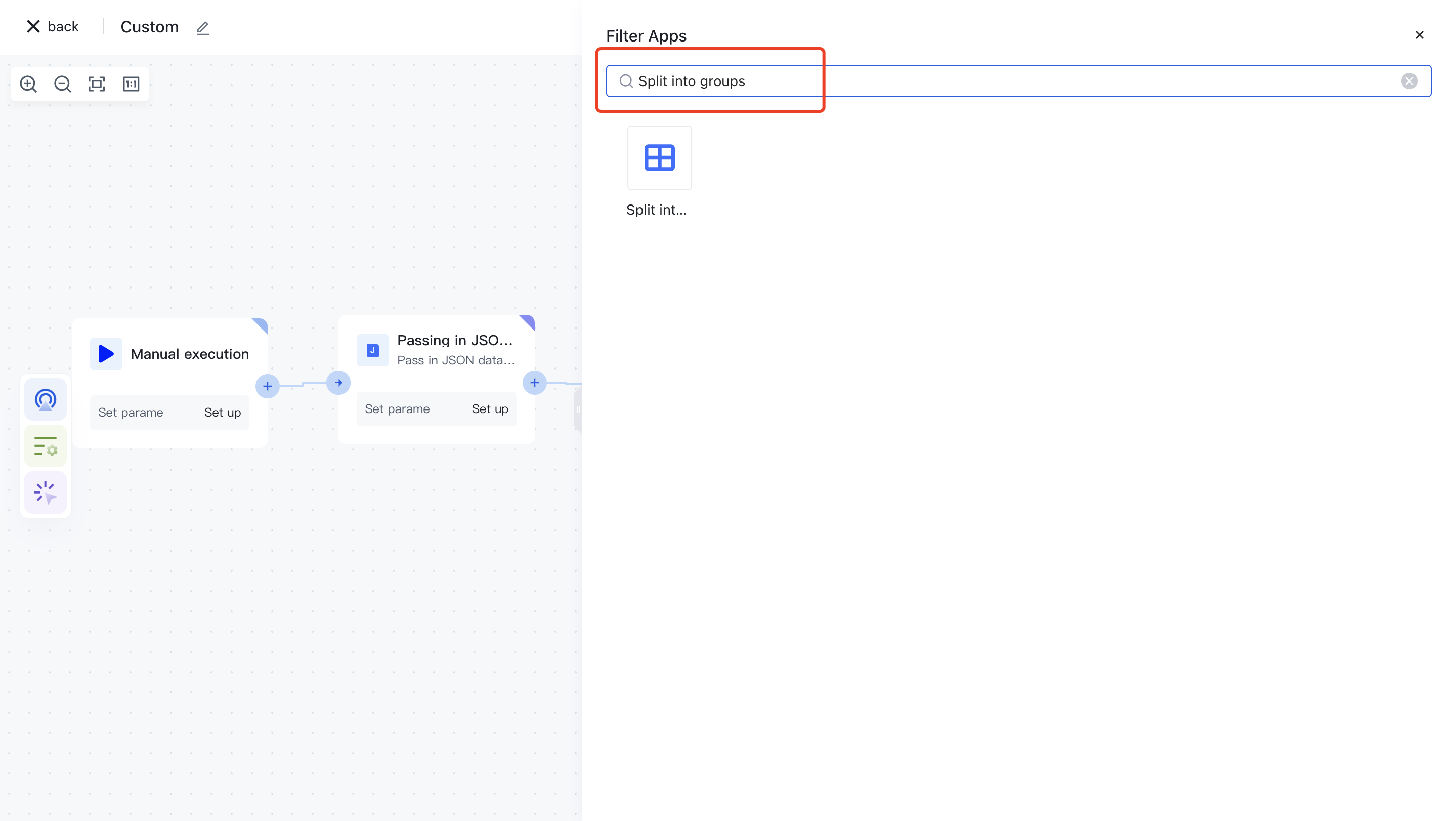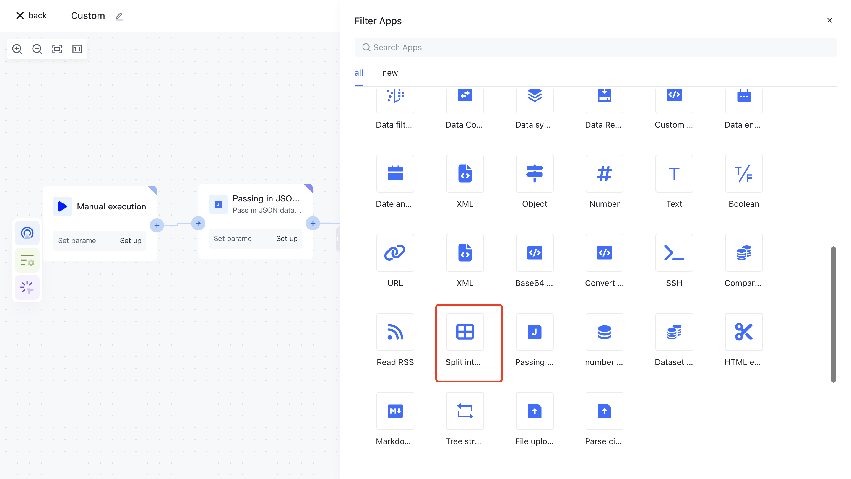 On the Add Node page, find the "Split Array" application node in the "Data Processing" category.