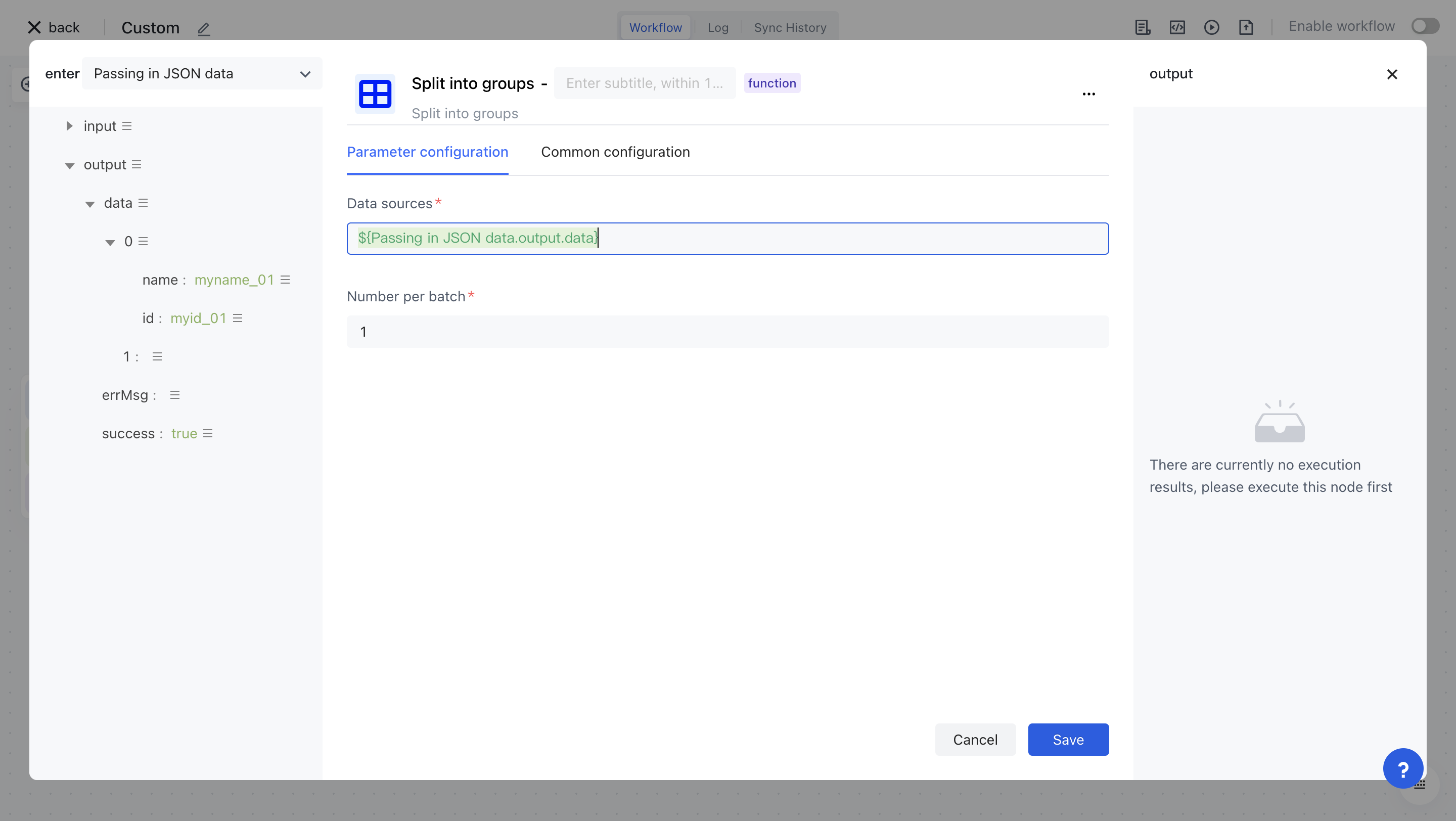Click on the "Run Log" column, then click on the expand button on the left side of the latest "Execution Batch" and "Split Array" nodes to view the node execution results.