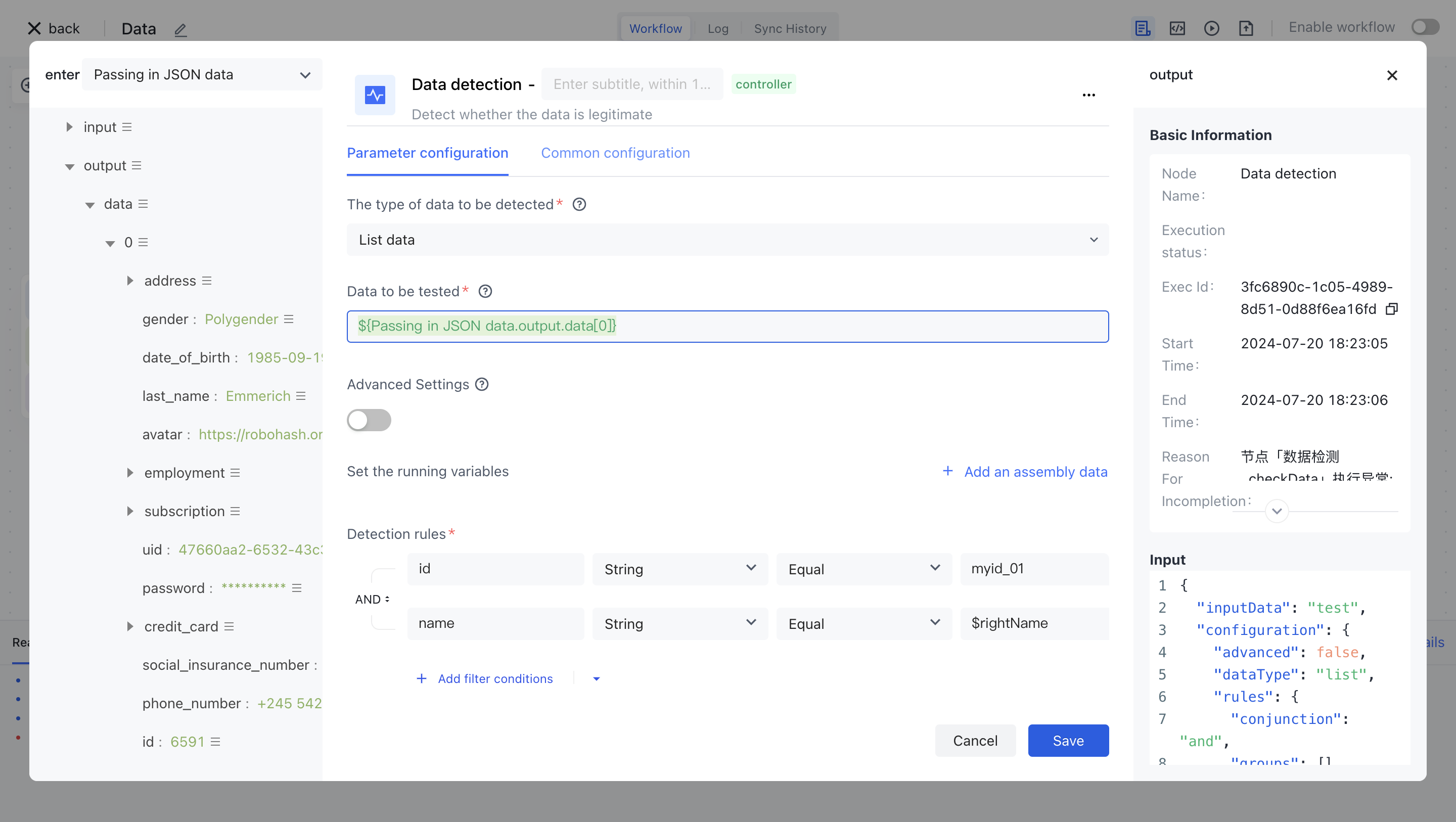 -The types of data to be tested include "List Data" and "Tree Structure Data". If you need to check the values of each element in an object or array, please choose the "List Data" mode; If you need to check a tree structure, such as whether the parent node of the child node exists or whether the node ID is duplicate, please choose the "Tree Structure" mode. -The data to be tested, the raw data to be tested, can be inputted by oneself or assembled through data assembly to assemble the data source before the current node. If this data is an array, then each item in the array will be checked.
